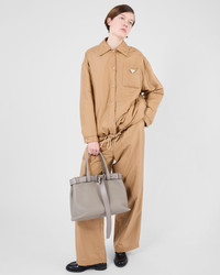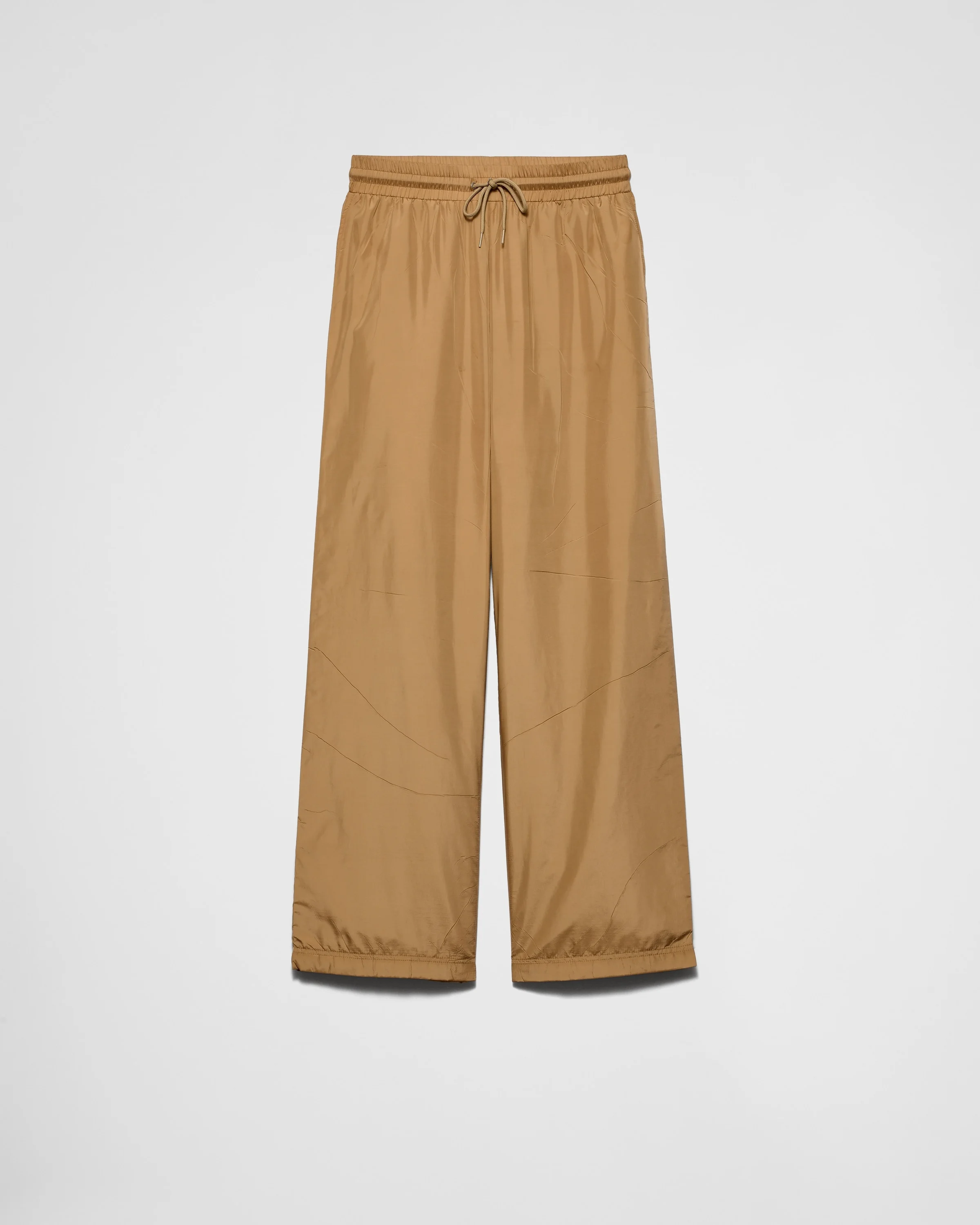 These pants with a sporty design are made of Re-Nylon with a relaxed, wide-leg silhouette completed with the enameled metal triangle logo. For sustainable care to preserve the product's characteristics and reduce microfiber shedding, we recommend not washing the item too often. Let the product air out after every use and have it dry cleaned at a specialized ecological dry cleaners. - Product code: 22H924_1WQ9_F0040_S_OOO - Wide leg fit - Lined - Elasticized drawstring waistband - Angled front slash pockets - Stitched hem - Enameled metal triangle logo - Back patch pocket - Pressed garment - Padded with wadding - The fabric is made with regenerated yarn obtained from recycled plastic materials collected in the ocean. - Imported - The model is 179 cm tall and wears a size 38 Height: 115cm MATERIALS Main material: 100% recycled polyamide