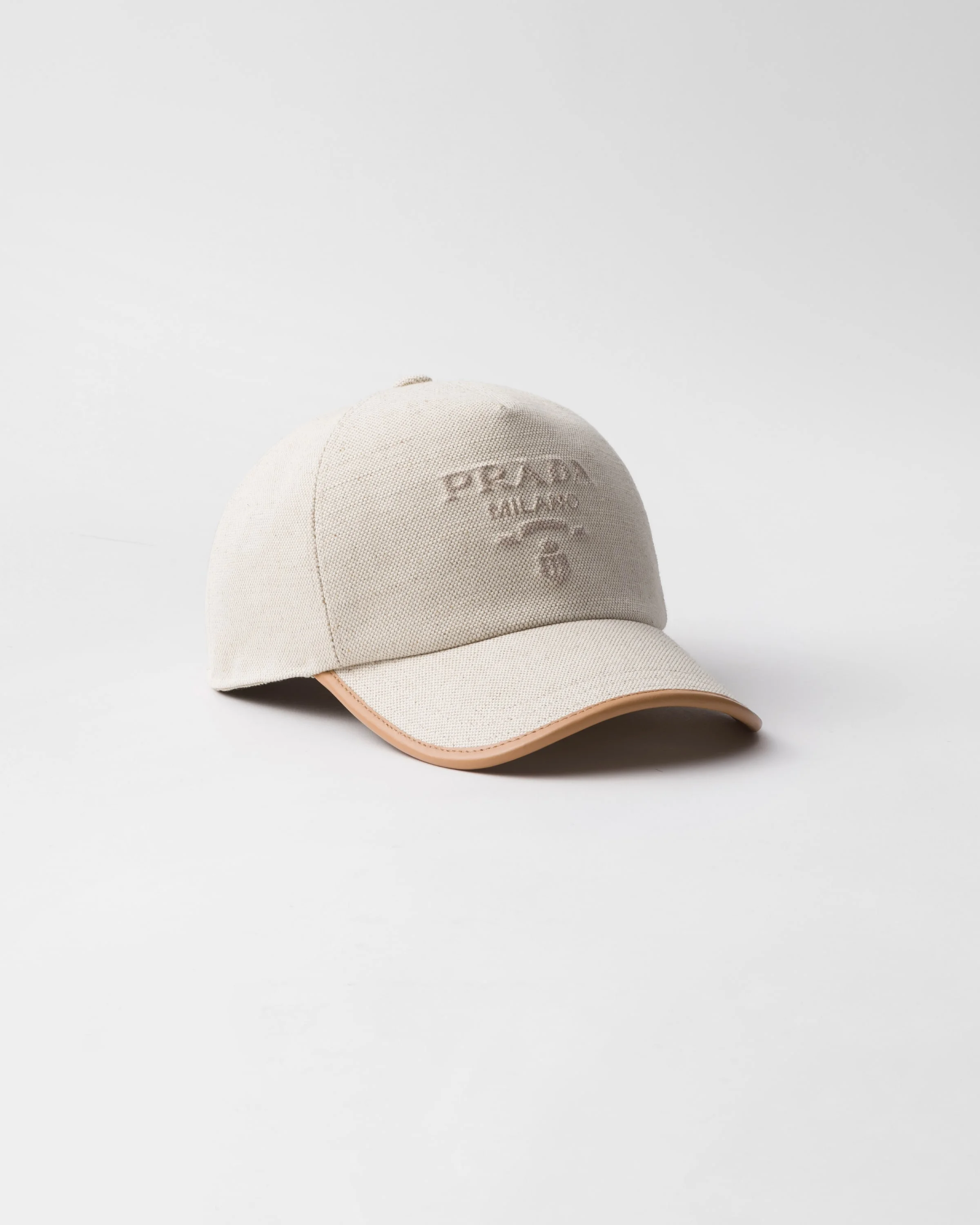This linen blend baseball cap with leather trim has contemporary, sporty charm. The accessory is completed by the embroidered tonal lettering logo. - Product code: 1HC179_ZPX_F0018 - Leather detail - Embroidered logo - Cotton lining - Imported MATERIALS Main material: Cotton linen