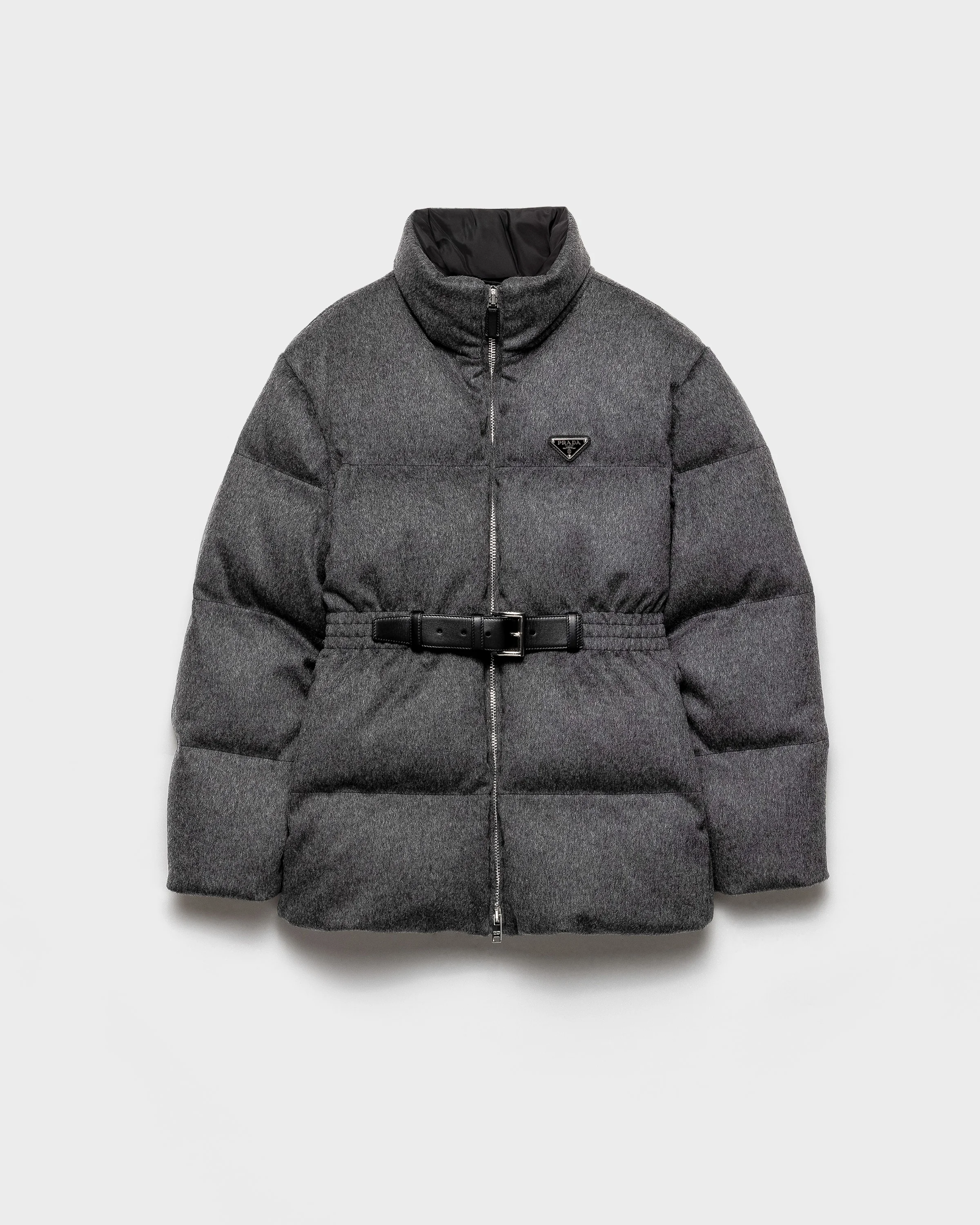 This technical garment made of a warm, cozy fabric features precious materials and details. The belt and metal triangle logo add a distinctive note to this style. - Product code: 29L131_C2O_F0480_S_OOO - Relaxed fit - The garment fits up to one size larger - Goose down padding - Stand-up collar - Long sleeves - Straight cuff - Zipper closure - Fabric triangle logo - Internal pocket with button - Leather belt - Lined garment - Elasticized waist - Inseam pockets - Imported - The model is 179 cm tall and wears a size 38 Height: 68cm MATERIALS Main material: 100% virgin wool