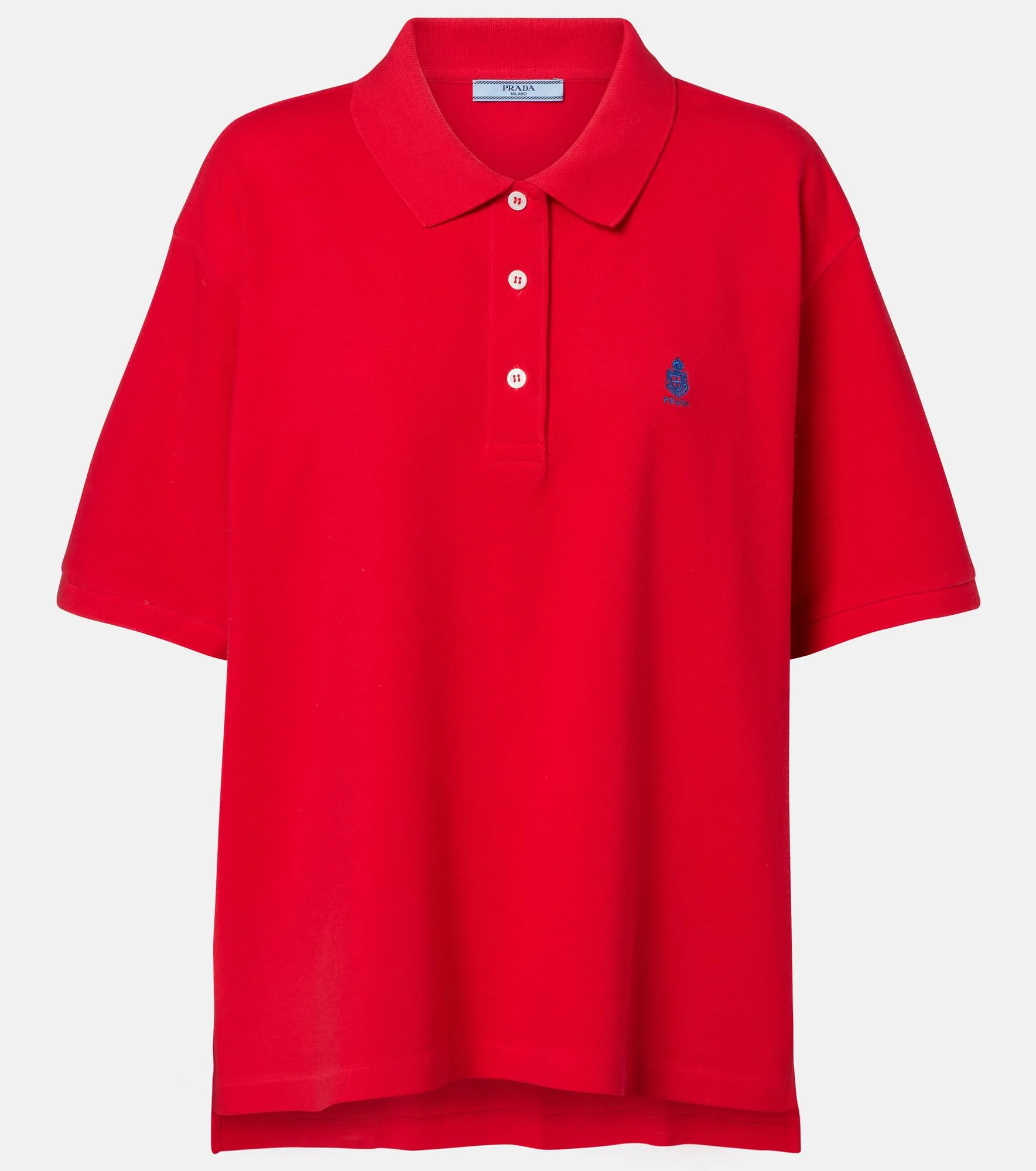 Prada embodies modern sophistication, blending timeless Italian craftsmanship with an innovative spirit. This polo shirt is rendered in pure cotton pique and defined by a layered silhouette, a deep V-neckline, and a contrasting embroidered logo at the chest. Product Details - Material: 100% cotton - Care instructions: hand wash cold - Made in Romania - Color: red - Designer color name: Rosso - Contains non-textile parts of animal origin - Collar: polo collar - Closure: partially buttoned front - Item number: P01160668 Size & Fit - True to size - Dropped shoulders - Oversized - Slightly stretchy fabric - Falls below the hip - The model seen in the picture is 178cm-5'10" and wearing a size IT 40