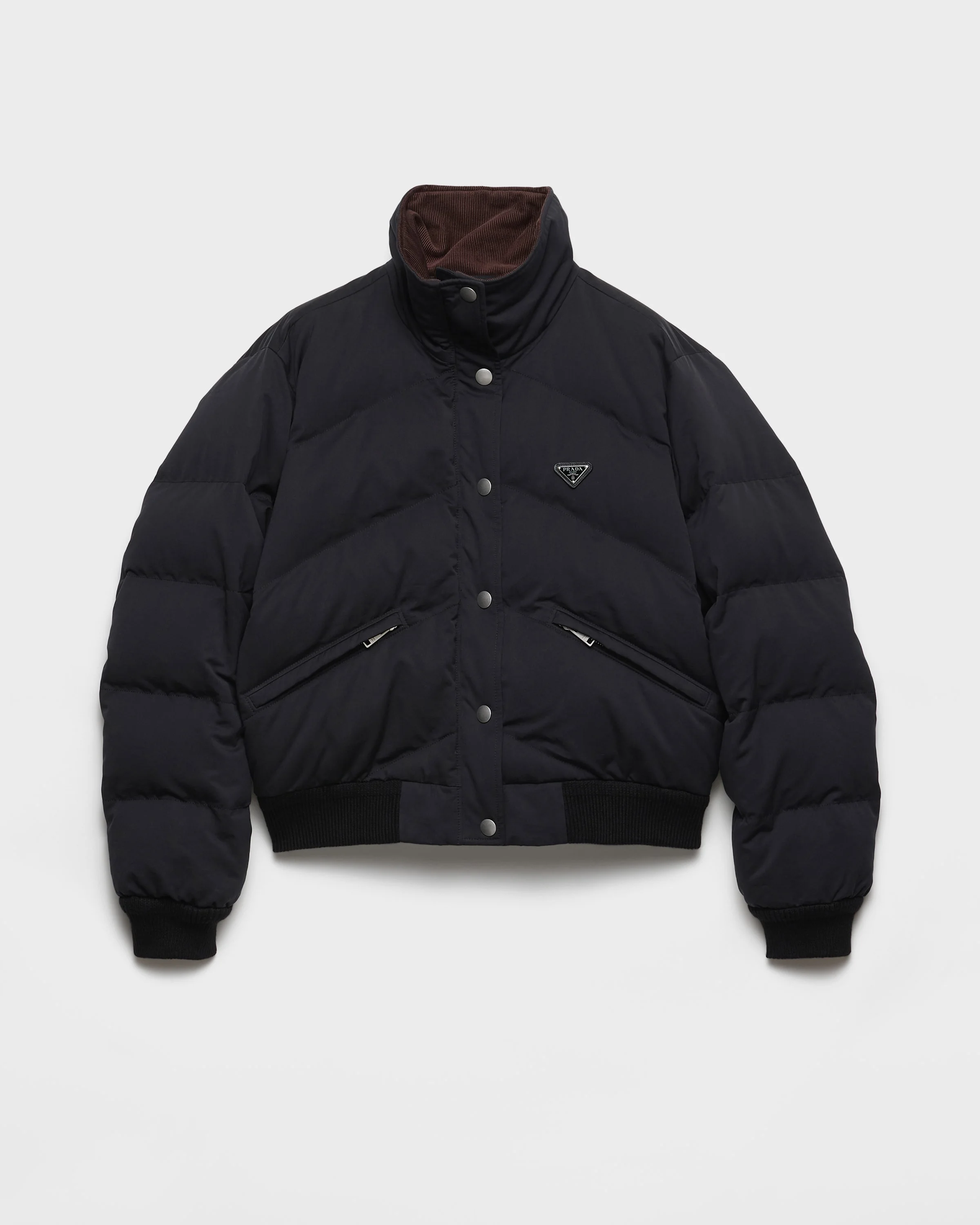 Winter textures and volumes define this cropped down jacket with goose down padding. The warm and functional garment is enriched with refined notes like the velvet collar lining, diagonal stitching, and knit details. The enameled metal triangle logo completes jacket with contemporary style. - Product code: 292288_17IB_F0002_S_EMO - Relaxed fit - The garment fits up to one size larger - Goose down padding - Velvet-lined collar - Long sleeves - Ribbed knit cuffs - Zipper and snap closure - Welt zipper pockets - Enameled metal triangle logo - Imported - The model is 179 cm tall and wears a size 38 Height: 60cm MATERIALS Main material: 85% cotton 15% silk