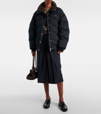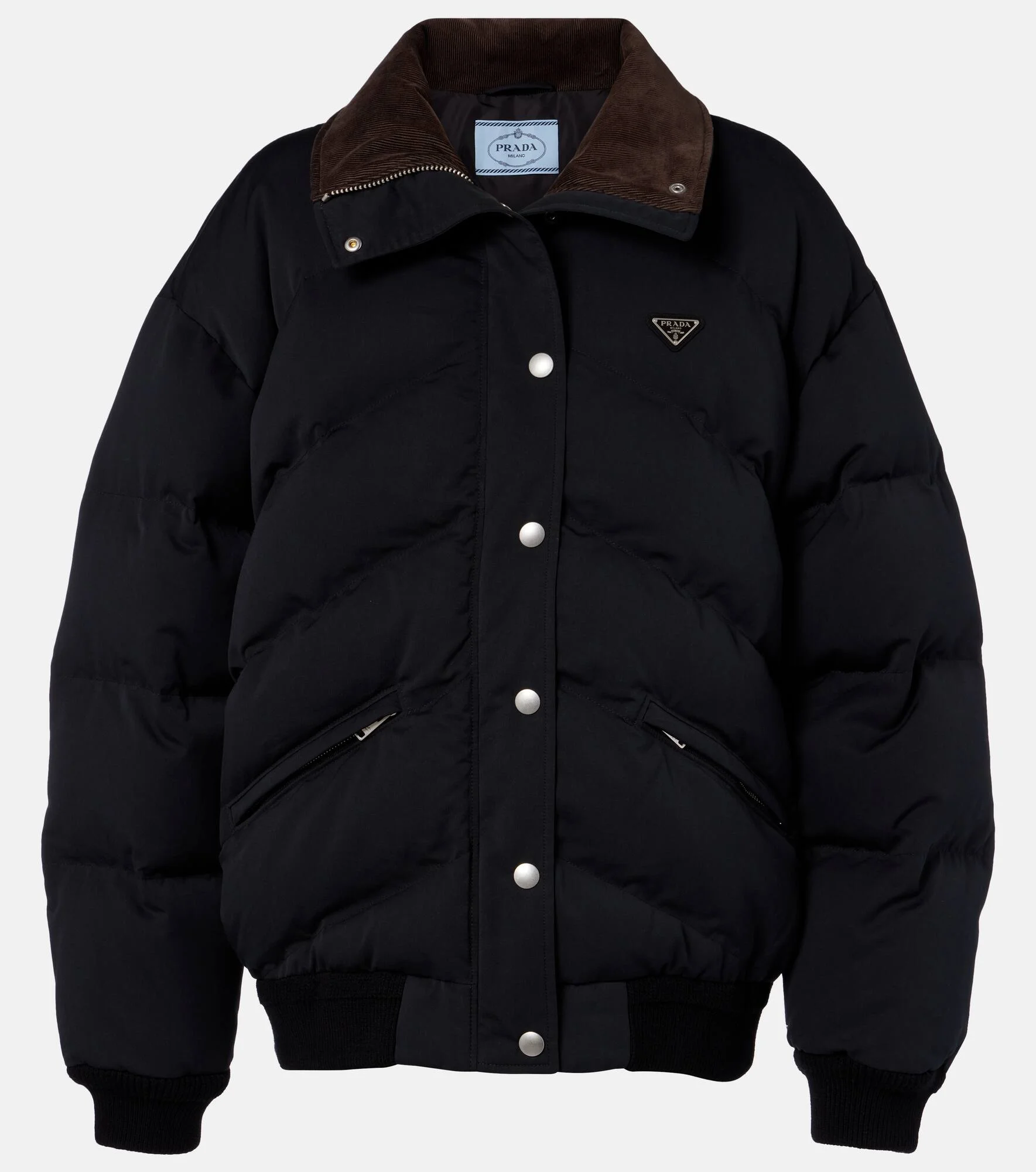 Prada takes Italian heritage into a distinctly modern direction with a streamlined and fashion-forward approach. This down jacket features the signature logo plaque at the chest and a corduroy collar. Product Details - Material: 85% cotton, 15% silk - Care instructions: dry clean - Made in Italy - Designer color name: Nero - Item color: black - Details: 100% leather - Closure: zipper, snap-button fastenings - Filling: 90% down, 10% feathers - Material II: 100% cotton - Filling II: 55% polyester (recycled), 45% polyester - Pockets: zipped pockets - Cuff: ribbed - Hem: ribbed - Contains non-textile parts of animal origin - Item number: P01061973 Size & Fit - True to size - Dropped shoulders - Elasticated hem - Oversized - Non-stretchy fabric - Falls below the hip - The model seen in the picture is 178cm-5'10" and wearing a size IT 40