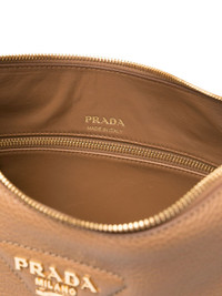 logo-embossed leather shoulder bag Prada showcases its signature refined aesthetic with this shoulder bag. It’s crafted from caramel-brown leather to a curved silhouette and finished with coordinating logo embossing and gold-tone lettering. Highlights - Caramel brown - Calf leather - Grained texture - Curve-edge body - Triangle logo - Gold-tone hardware - Top zip fastening - Detachable logo-jacquard shoulder strap - Main compartment - Internal patch pocket - Internal zip-fastening pocket - Internal logo stamp - Full lining - This piece comes complete with a protective dust bag. Composition Outer: Calf Leather 100% SIZE & FIT Model measurements Height 5 ft 10 in(1.77 m) Bust/Chest 31.88 in(81 cm) Hips 36.22 in(92 cm) Waist 24.01 in(61 cm) Measurement DEPTH 2.75 in(7 cm) HEIGHT 9.84 in(25 cm) STRAP 11.81 in(30 cm) WIDTH 12.2 in(31 cm)