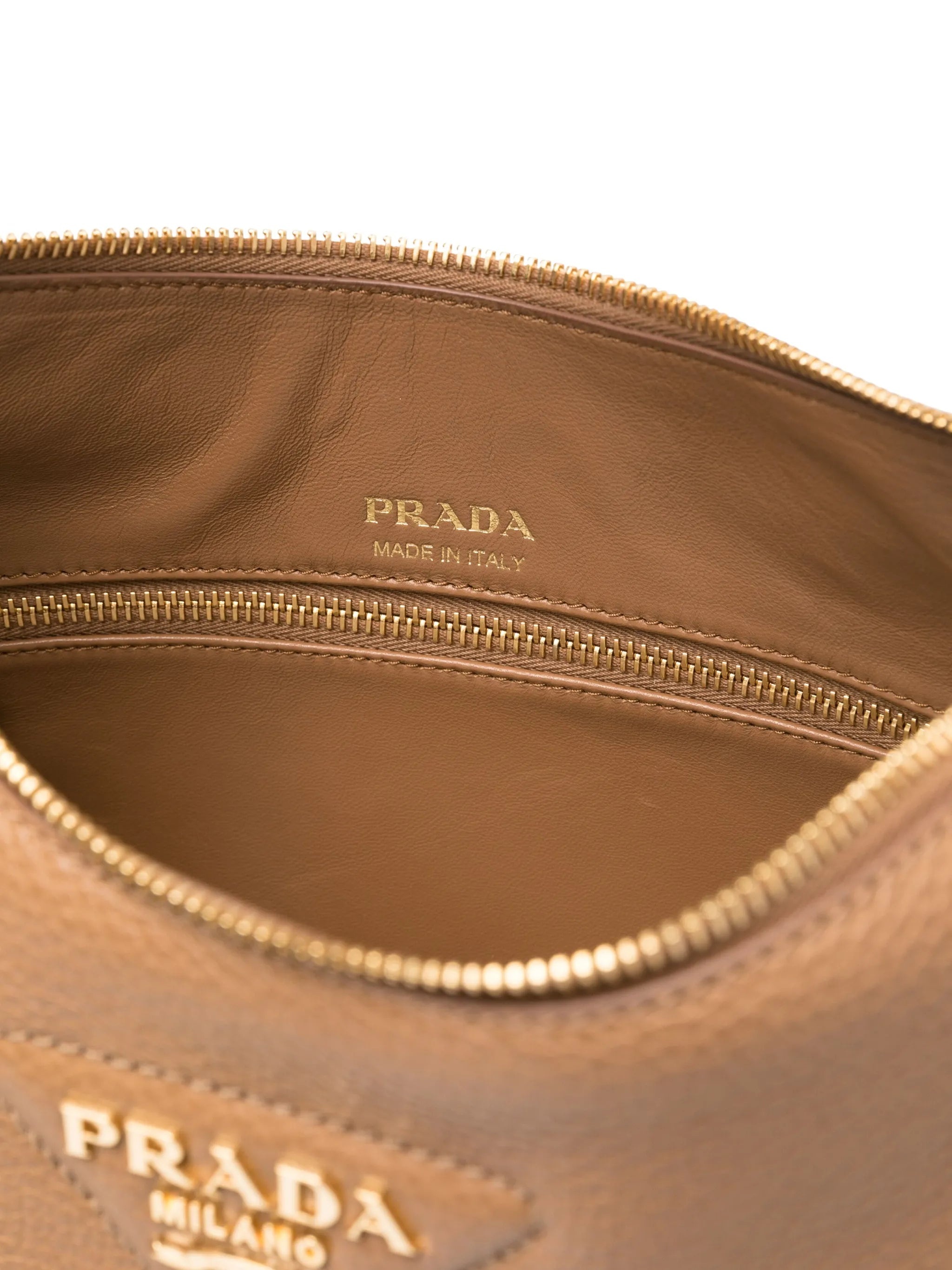 caramel brown calf leather grained texture curve-edge body triangle logo gold-tone hardware top zip fastening detachable logo-jacquard shoulder strap main compartment internal patch pocket internal zip-fastening pocket internal logo stamp full lining This piece comes complete with a protective dust bag. - depth: 7.0 centimetres, height: 25.0 centimetres, strap: 30.0 centimetres, width: 31.0 centimetres - Color: BROWN - Made in: Italy - Designer Style ID: 1BC178 V 1OO 2DKV F03OG Composition and care Outer Composition Calf Leather: 100.0%