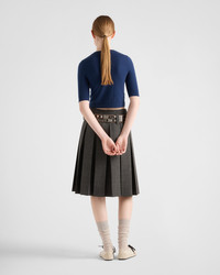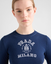College style, combining sporty elements and retro touches, inspires the design of this cashmere sweater enhanced by a reinterpretation of the Prada intarsia logo in a contrasting color. - Product code: P24L2Z_16NZ_F057L_S_OOO - Short sleeves - Plain knit - Boxy fit - Crew neck - Regular shoulder - Intarsia logo - Imported - The model is 179 cm tall and wears a size 38 Height: 43cm MATERIALS Main material: 100% cashmere