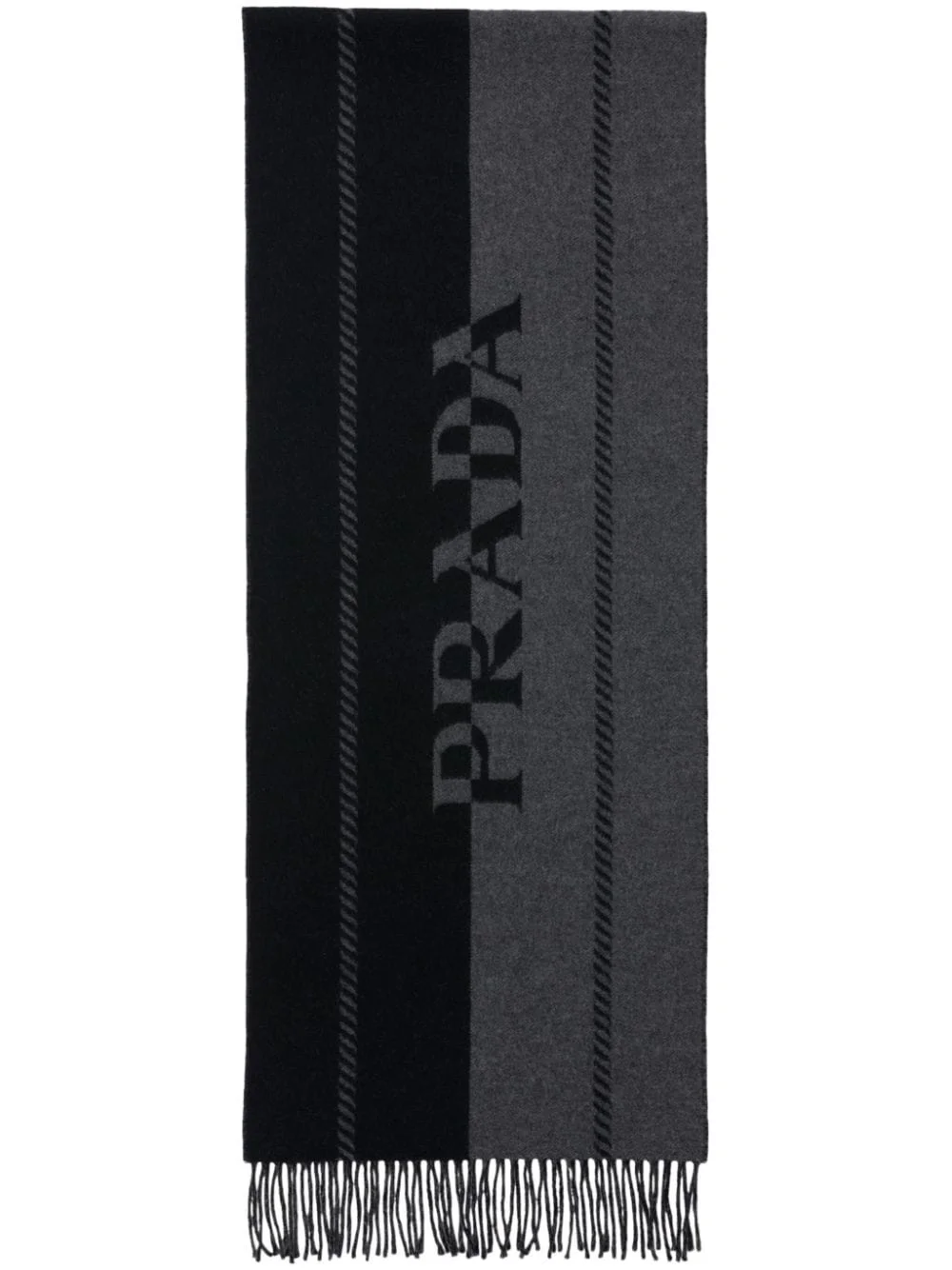 logo-jacquard wool scarf Prada’s wool scarf is distinguished by its unique two-tone colourway. It’s adorned with an intarsia-knit logo and traced with fringes. Highlights - Black/medium grey - Wool - Knitted construction - Intarsia-knit logo - Fringed edge Composition Wool 100% SIZE & FIT Measurement LENGTH 70.07 in(178 cm) WIDTH 13.77 in(35 cm)