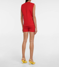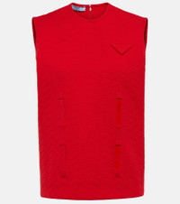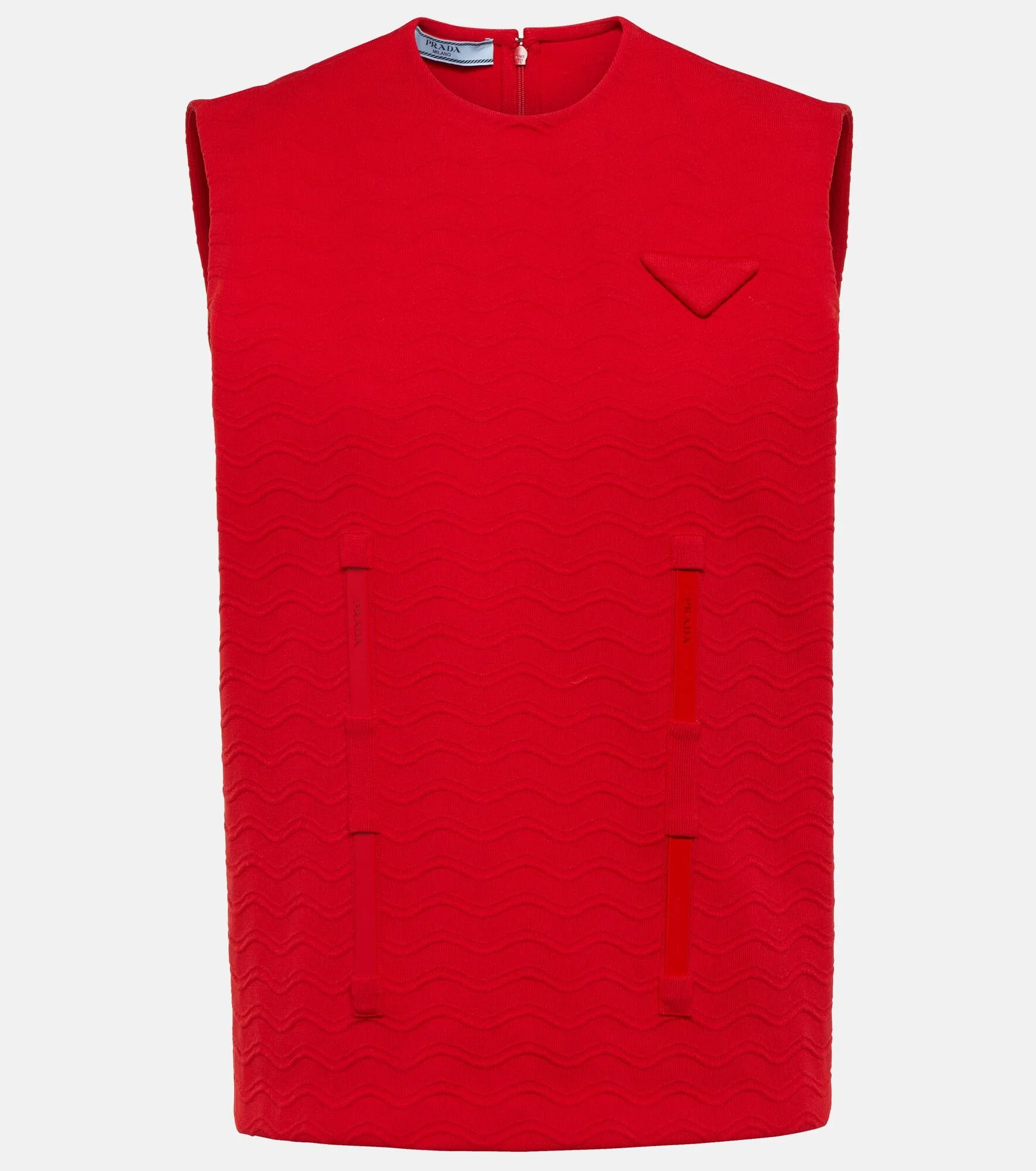 This Prada top is adorned with a tonal, label-signature, triangular plaque that’s instantly recognizable by those in the know. It’s elevated by a raised, wavy, ribbed effect and logo tape that loops through the front. Product Details - Made in Italy - Closure: zipped back - Care instructions: dry clean - Designer color name: Rosso - Material: 100% polyester - Item number: P00655866 Size & Fit - True to size - Straight fit - Falls to the hip - The model seen in the picture is 178cm-5'10" and wearing a size IT 40