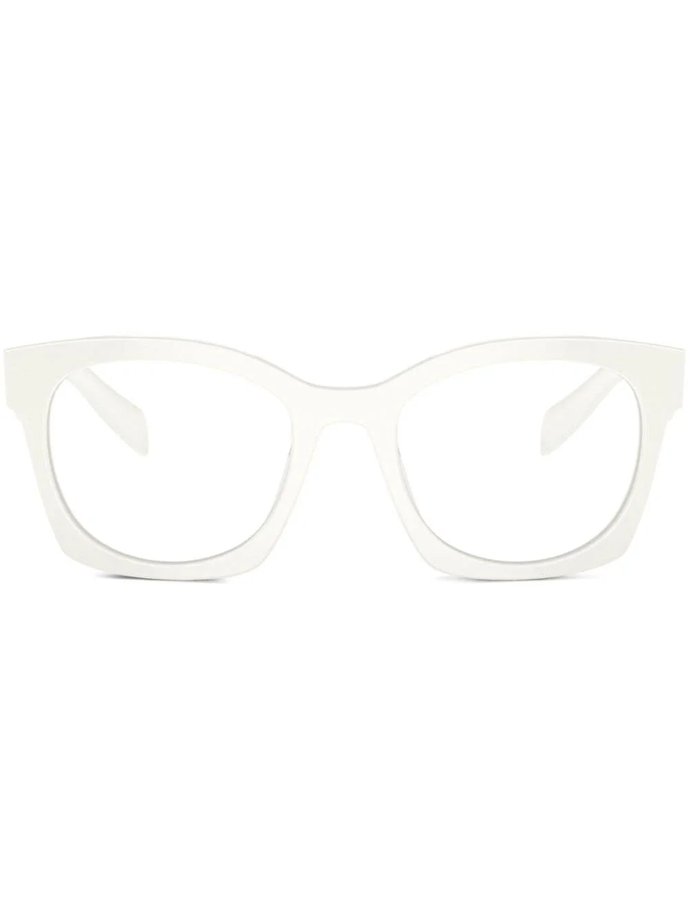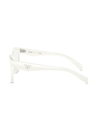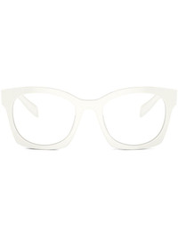 logo-lettering D-frame glasses Made from acetate to a classic D-frame, these white Prada glasses are a minimalist, timeless staple accented with silver-tone logo lettering at the temples for an understated point of interest. Highlights - White - Acetate - Silver-tone logo lettering at the arms - D-frame - Clear lenses - Straight arms - Curved tips - All glasses from farfetch are sold as non-prescription frames. - These glasses come with a protective case. Composition Acetate 100%