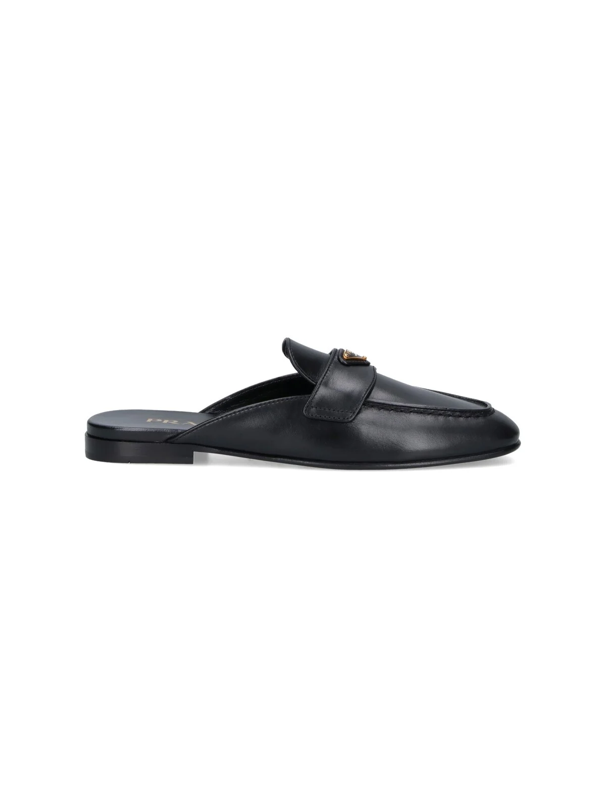 PRADA LOGO MULES IN BLACK CALF LEATHER WITH ROUND TOE, TRIANGLE METAL ENAMEL LOGO DETAIL ON THE FRONT, SLIP-ON FIT, LEATHER SOLE. PRODUCT INFO PRODUCT CODE 1D766N 010 070F0002 COMPOSITION: 100% CALF LEATHER MADE IN: ITALY - SOLE: 100% LEATHER