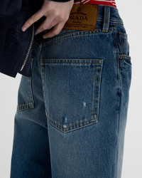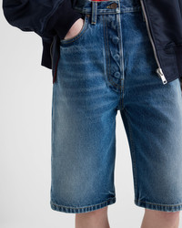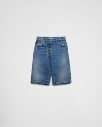 These Bermudas with a wide-leg silhouette have a used effect that emphasizes the texture of the denim, giving the style vintage allure. The design, characterized by the classic five pockets, is completed by the archive logo printed on a label. - Product code: GFP523_16PK_F0V3N_S_OOO - Used treatment - Mid-rise waist - Hem width: 27 cm, Size: 25 - Button fly - Contrasting stitching - Rounded front pockets with coin pocket - Patch pockets on the back - Total length 60 cm, size: 25 - Prada Milano logo label on the back - Imported - The model is 176 cm tall and wears a size 38 Height: 60cm MATERIALS Main material: 100% cotton