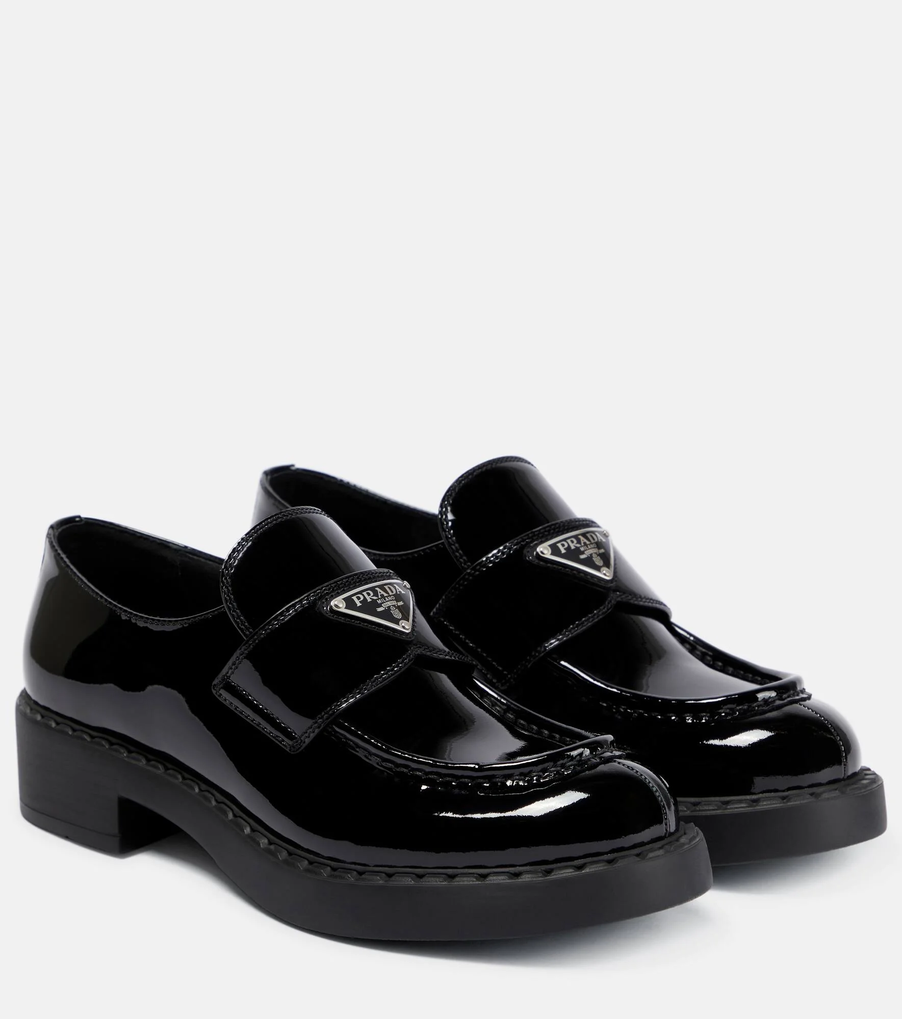 These chunky loafers from Prada are a sleek update to a classic style. Made from black patent leather, the design is set on rubber platform soles and features the brand's iconic triangle logo. Product Details - Upper: leather - Lining: leather - Sole: leather insole, rubber sole - Toe shape: almond toe - Made in Italy - Includes: shoe box, dust bag - Designer color name: Nero - Hardware color: silver - Item number: P00695476 Size & Fit - True to size - Slightly narrow - European sizes - 4cm-1.5" heel (size EU 38) - 2,5cm-1" platform (size EU 38)