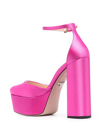 logo-plaque 135mm platform pumps Prada's triangle logo plaque is an iconic motif that is used throughout the brand's collections. Here the logo appears on these platform pumps, making this pair instantly recognisable. Composition Outer: Satin 100% Lining: Leather 100% Sole: Leather 100% SIZE & FIT Measurement HEEL 5.31 in(13.5 cm) PLATFORM 1.77 in(4.5 cm)