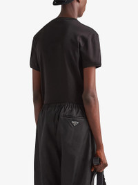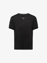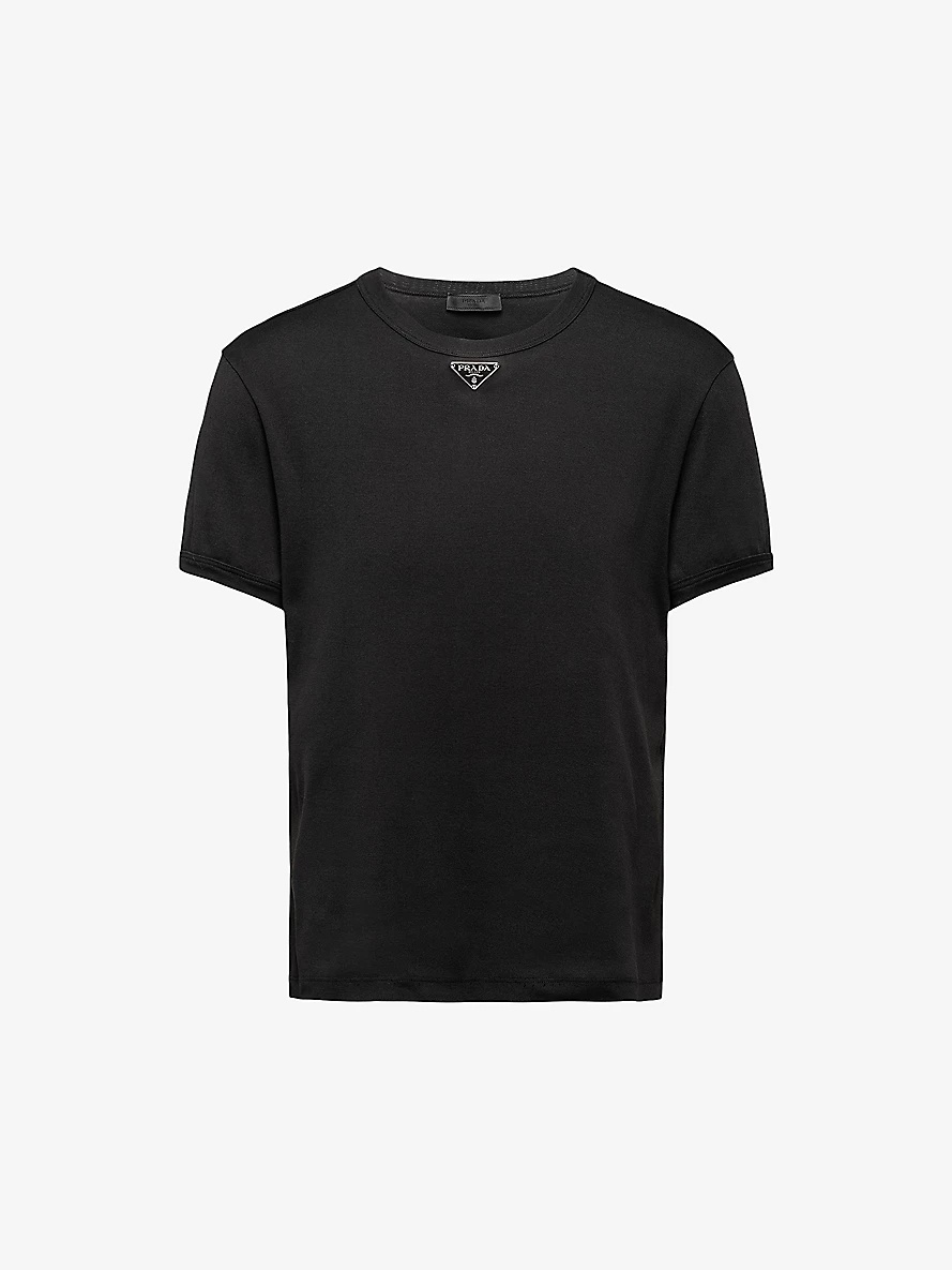PRODUCT DETAILS - Prada cotton T-shirt - 100% cotton - Pulls on - Slim fit, round neck, ribbed trim at neck, short sleeves, triangle brand plaque at front - Dry clean - Model is 6ft 1in/1.88m and wears a size medium - Lightweight, slight stretch Ref: R04268410