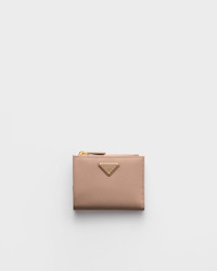 This Saffiano leather wallet with enameled metal triangle logo is sleek and elegant. The accessory with clean lines has a zipper coin compartment, bill compartment, and card slots. - Product code: 1ML050_QHH_F0236 - Snap closure - Enameled metal triangle logo - One bill compartment - Six card slots - Two internal pockets - Internal zipper coin compartment - Moire and Saffiano leather lining - Imported Height: 8.5cm Width: 11.5cm MATERIALS Main material: Calfskin