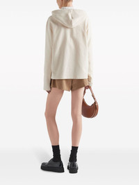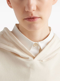 logo-plaque hooded T-shirt Prada embellishes this stretch-cotton hooded top with a tonal triangle logo, offering a subtle recognisable touch. Highlights - Almond beige - Stretch-cotton - Jersey texture - Logo patch at the chest - Drawstring hood - Long sleeves - Straight hem Composition Cotton 98%, Elastane 2%