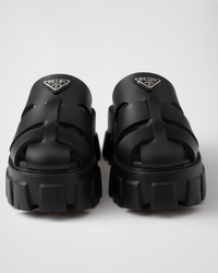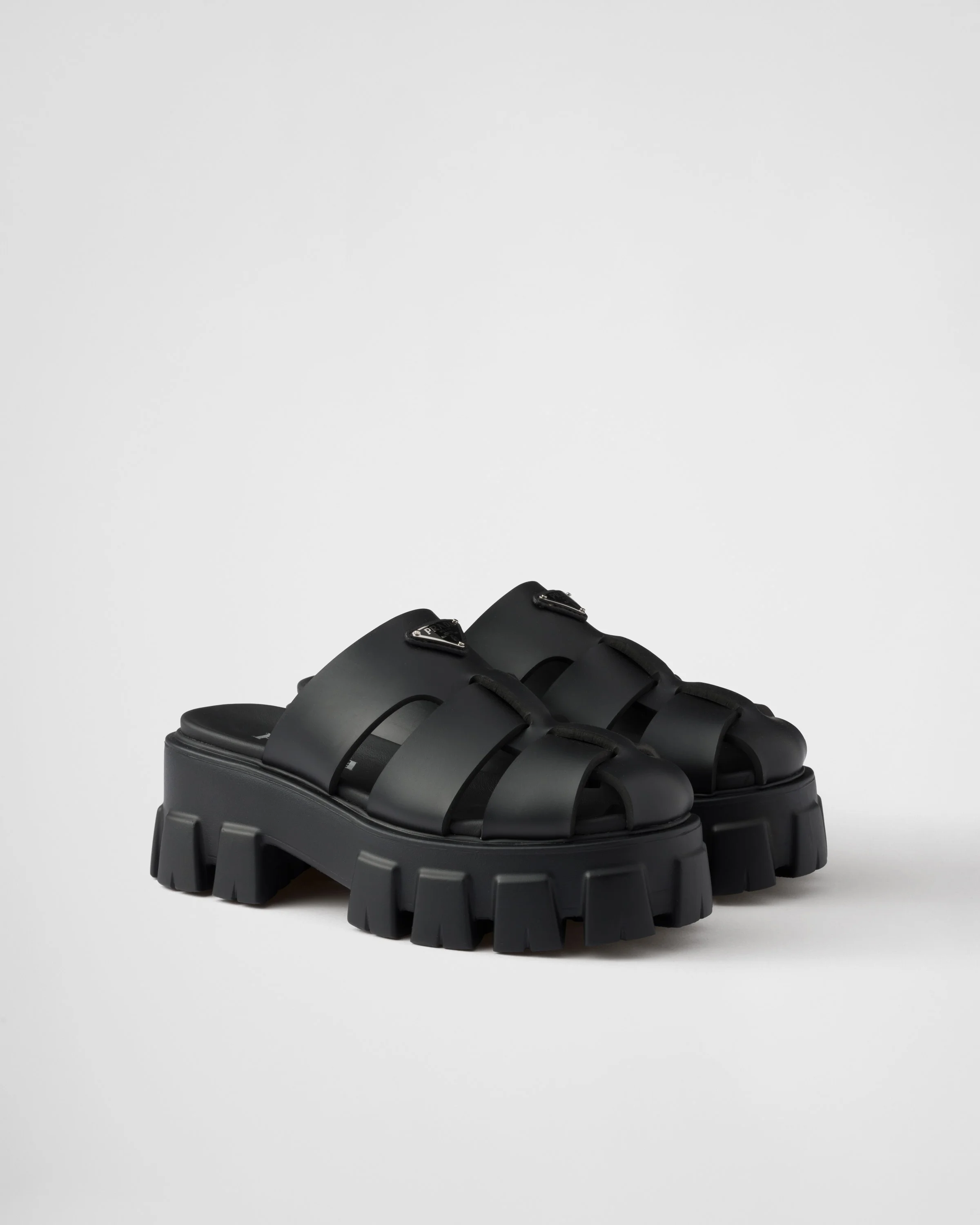 The distinctive Monolith sole, characterized by oversized volumes and architectural lines, defines the silhouette of these rubber mules embellished with the emblematic enameled metal triangle logo. - 商品品番: 1XX751_3LKK_F0002_F_055 - Enameled metal triangle logo - Rubber sole, 55 mm - Lug tread - インポート MATERIALS 主な素材: Ethyl vinyl acetate - eva