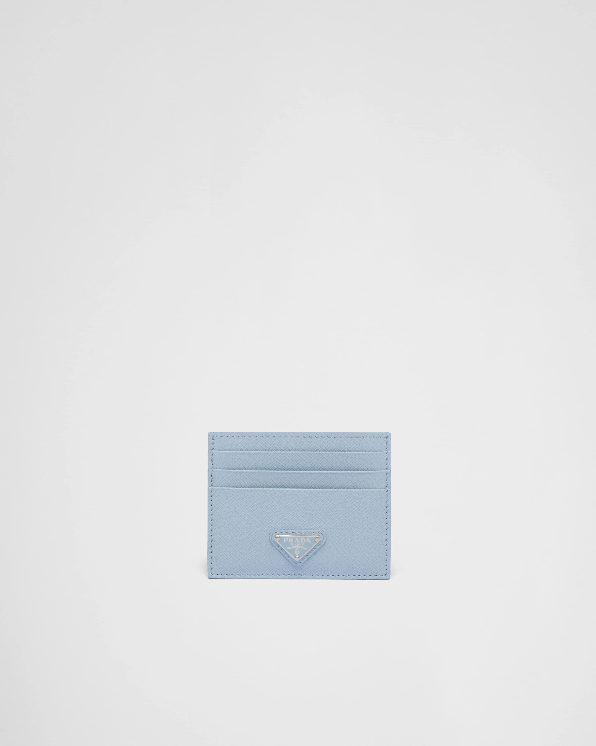 The unmistakable texture of Saffiano leather characterizes this sleek card holder. The accessory with six card slots is decorated with a tonal enameled metal triangle logo. - Product code: 1MC025_QHH_F0EMZ - Enameled metal triangle logo - Six card slots - One inside pocket - Moire and Saffiano leather lining - Imported Height: 8cm Width: 10cm MATERIALS Main material: Calfskin