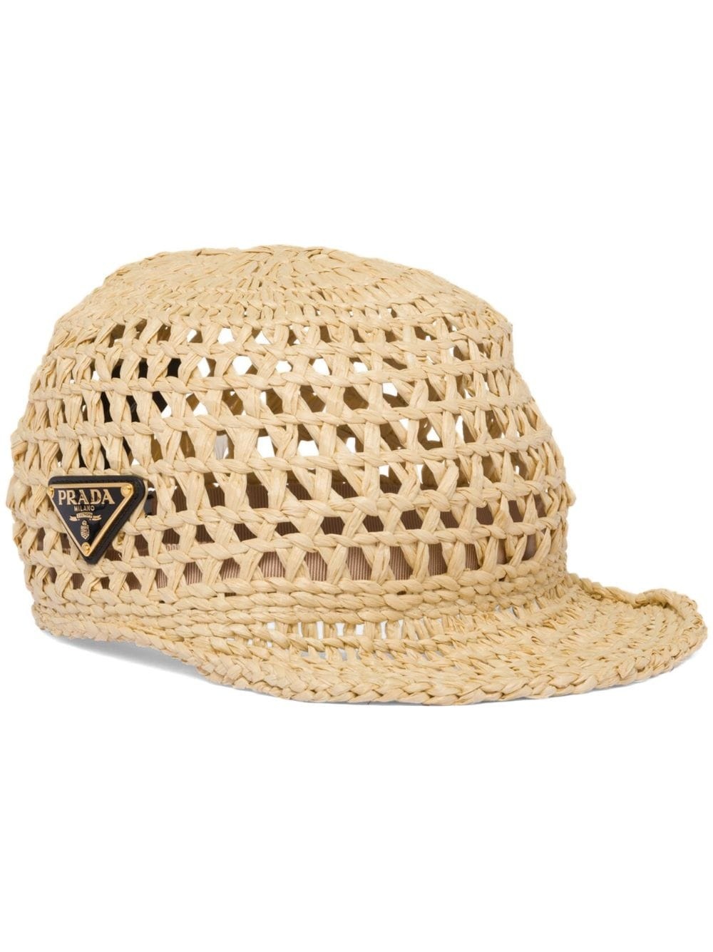 logo-plaque woven raffia hat At once elevated and casual, Prada reimagines the cap silhouette in a woven raffia construction for a carefree look. The brand's signature triangle logo is placed at the side for an added sophisticated touch. Highlights - Light beige - Raffia - Interwoven design - Enamel triangle logo - Flat peak - Narrow brim Composition Raffia 100%