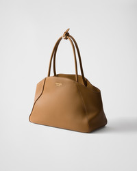 This leather tote bag features elegant, curved lines and a large, practical opening. Its clean design is enhanced by simple yet refined details, showcasing the brand's exceptional artisanal craftsmanship. The sophisticated lettering logo highlights its refined simplicity. - Product code: 1BG519_2CYS_F03BH_V_OOO - Leather handles - Metal hardware - Stamped lettering logo on the front - Cotton lining with three pockets, including one with zipper - Imported Height: 26.5cm Width: 35cm Length: 15cm MATERIALS Main material: Calfskin