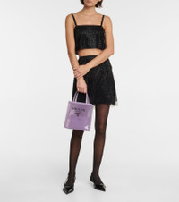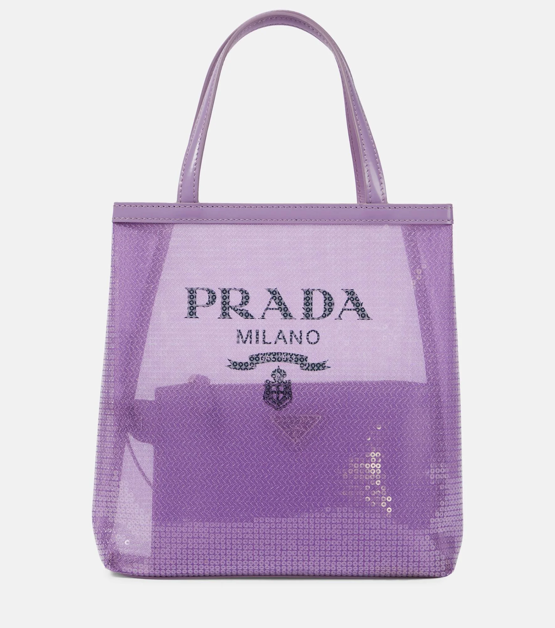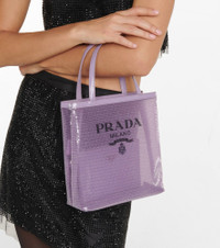 Store your essentials in true Prada style with this small tote. The boxy design is covered with semi-transparent purple sequins and comes with a handy pouch. Product Details - Material: fabric - Internal details: fabric lining, internal zipped pouch - Designer color name: Lilium - Made in Italy - Comes with dust bag - Top handles - Closure: open top - Item number: P00627819 Size & Fit - Height 22,5cm-9" - Width 21cm-8.5" - Depth 8cm-3" - Length of handles 28cm-11" - Clutch height 11cm-4.5" - Clutch width 17cm-6.5"