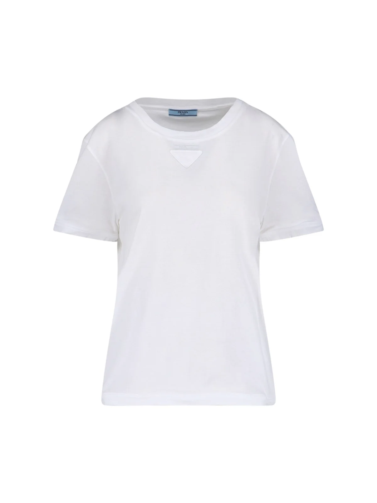 PRADA LOGO T-SHIRT IN WHITE COTTON WITH CREWNECK, SHORT SLEEVES, TONE-ON-TONE TRIANGLE LOGO DETAIL ON THE FRONT, STRAIGHT HEM. PRODUCT INFO PRODUCT CODE 3569B OOO 18QZF0009 COMPOSITION: 100% COTTON SIZE AND FIT: REGULAR FIT MADE IN: ITALY