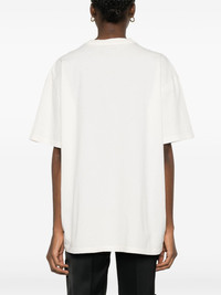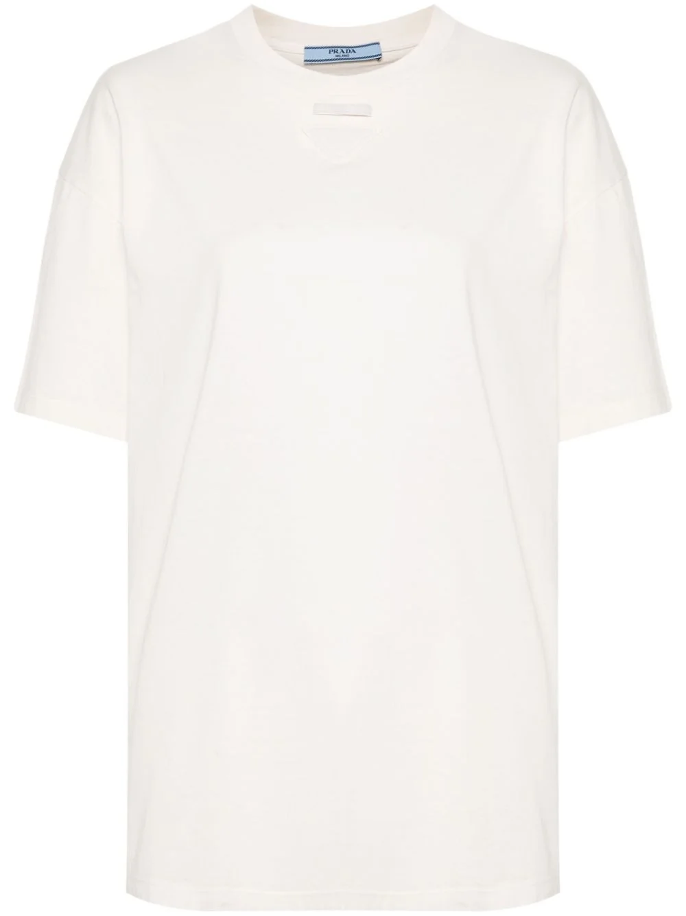 embroidered triangle-logo T-shirt Prada's beloved triangle logo runs through all its collections, adding a signature touch to even the most casual pieces. This cotton T-shirt is a fine example of this. Below the crew neckline, the geometric motif lends a subtle branded feel to this garment. Highlights - Cream white - Cotton - Jersey texture - Rounded collar - Mini logo tag - Embroidered triangle logo - Short sleeves - Straight hem Composition Cotton 100% SIZE & FIT Model measurements Height 5 ft 10 in(1.78 m) Bust/Chest 31.49 in(80 cm) Hips 37 in(94 cm) Waist 23.62 in(60 cm) FittingInformation Designed for an oversized fit, offering additional room throughout Made from a midweight non-stretch fabric, this piece offers minimal elasticity when worn This piece fits true to size – take your usual size Washing instructions Dry Clean Only