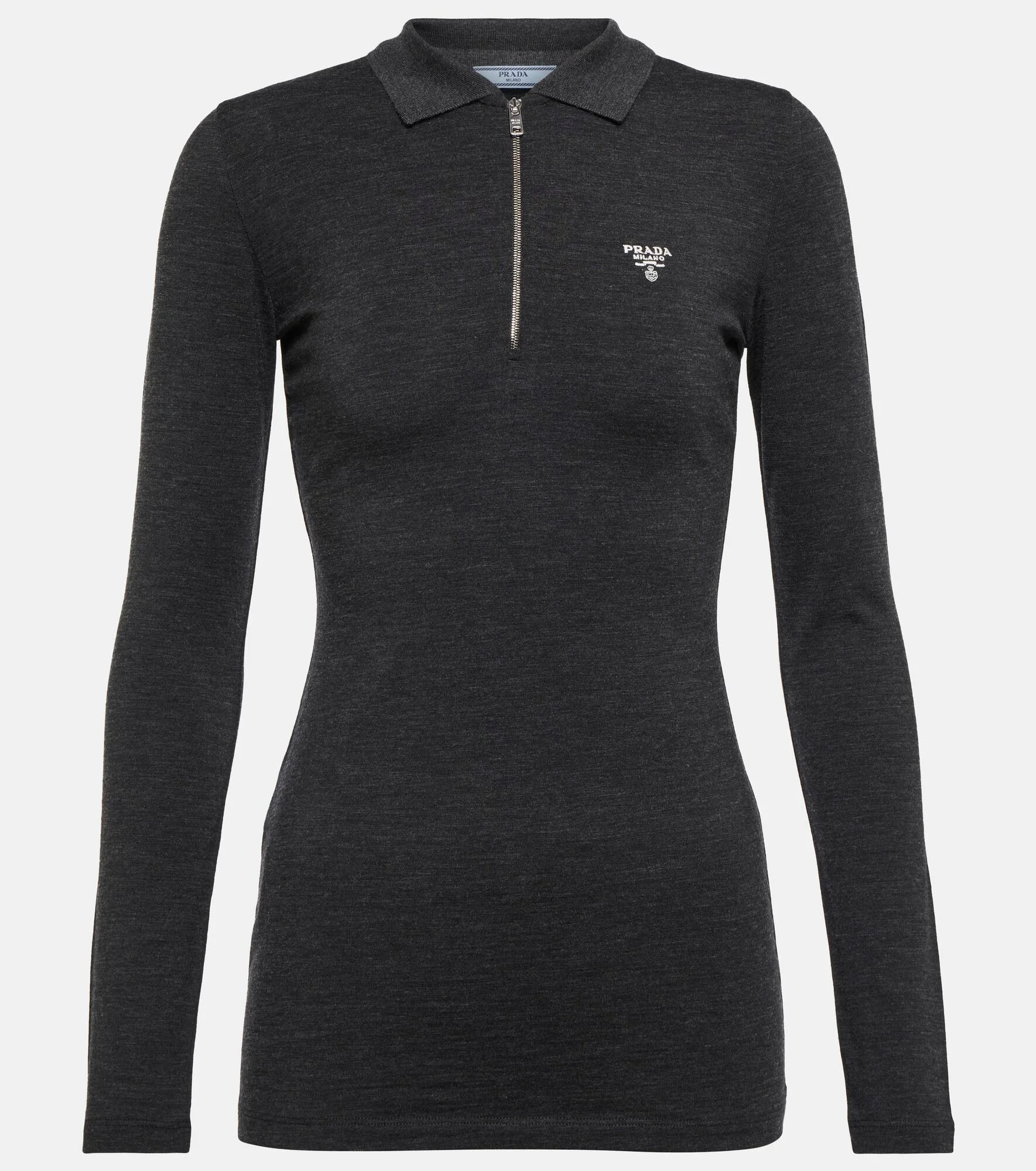 Elevate your everyday edit with this zip-detailed sweater from Prada. Made in Italy, it's spun from a stretch-wool blend to a slim fit and features the label's iconic embroidered logo. Product Details - Material: 68% wool, 28% silk, 4% elastane - Material II: 70% cashmere, 30% silk - Made in Italy - Designer color name: Antracite - Care instructions: dry clean - Closure: zipped front - Item number: P00695282 Size & Fit - True to size - Fitted - Falls to the hip - The model seen in the picture is 178cm-5'10" and wearing a size IT 40