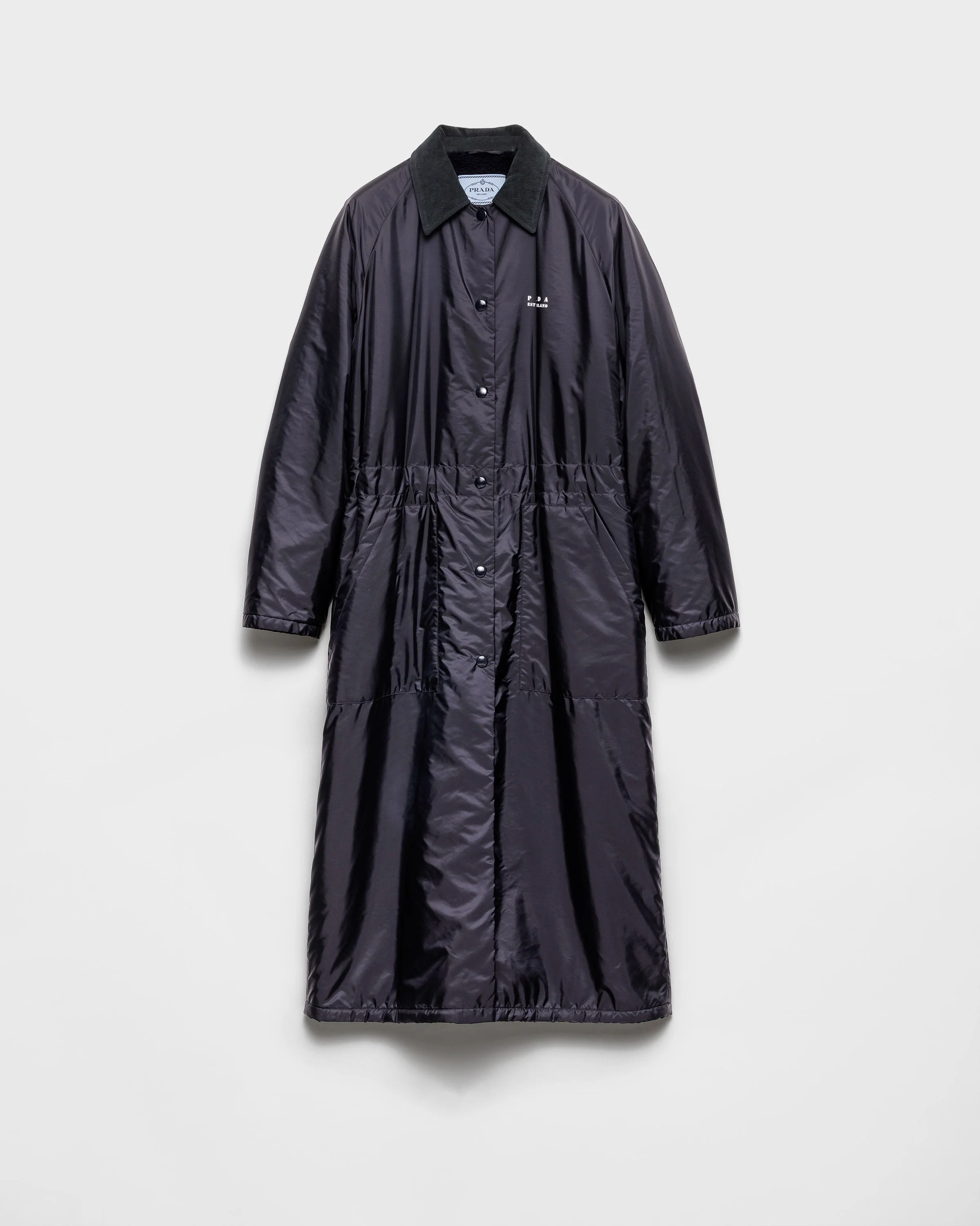 Sleek lines and functional details define this raincoat made of Re-Nylon, Prada's emblematic fabric with an innovative and versatile character. The garment has a light, oversized silhouette decorated with the iconic geometric shape of the triangle logo. For sustainable care to preserve the product's characteristics and reduce microfiber shedding, we recommend not washing the item too often. Let the product air out after every use and have it dry cleaned at a specialized ecological dry cleaners. - Product code: 29X287_1WQ9_F0008_S_OOO - Lined garment - Shirt-style collar in another fabric - Raglan sleeves - Button closure - Patch pockets - Triangle logo and lettering logo - Internal drawstring at the waist - Imported - The model is 178 cm tall and wears a size 38 Height: 130cm MATERIALS Main material: 100% recycled polyamide