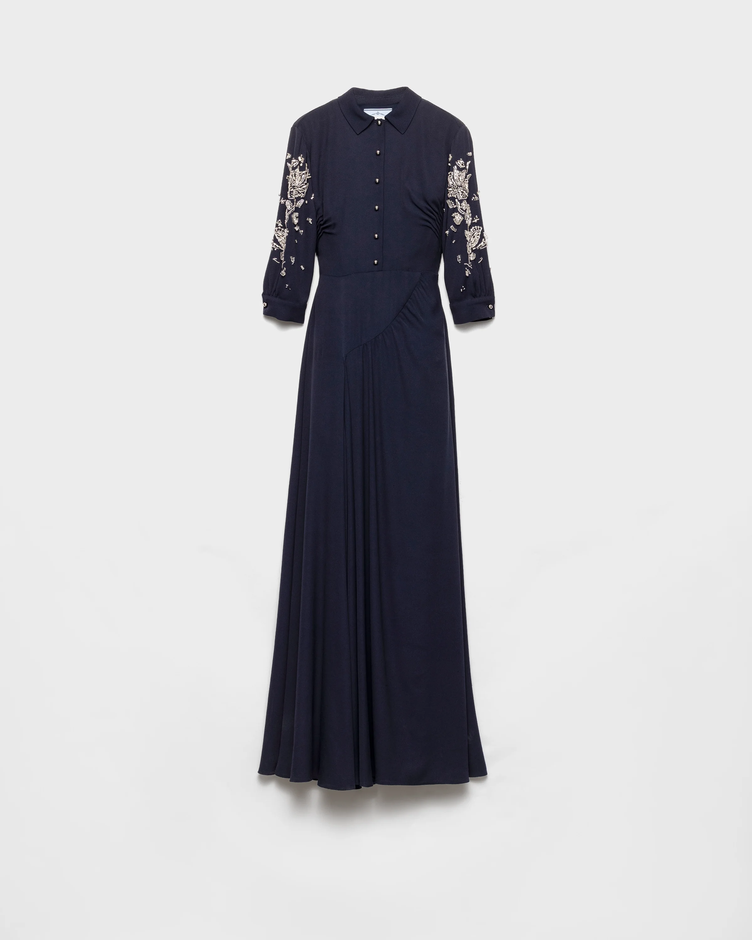 Fluid lines and feminine details define the silhouette of this long sable dress. Dazzling embroidery embellishes the elegant and contemporary design. - Product code: P3Q41R_1745_F0008_S_OOO - Partially-lined garment - Shirt-style collar - Side zipper closure - Front button closure - Three-quarter sleeves with cuff and button - Imported - The model is 176 cm tall and wears a size 38 Height: 160cm MATERIALS Main material: 38% silk 62% viscose