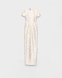 The refined couture construction of this long dress defines a garment with romantic, contemporary elegance. The silhouette combines pure lines and volumes in a sophisticated design, animated by a delicate floral print. - Product code: P3P56_178P_F0061_S_OOO - Lined garment - Round neck - Back zipper closure - Short sleeves - Inseam pockets - Back slit - Straight hem - Imported - The model is 176 cm tall and wears a size 38 Height: 160cm MATERIALS Main material: 52% silk 48% wool