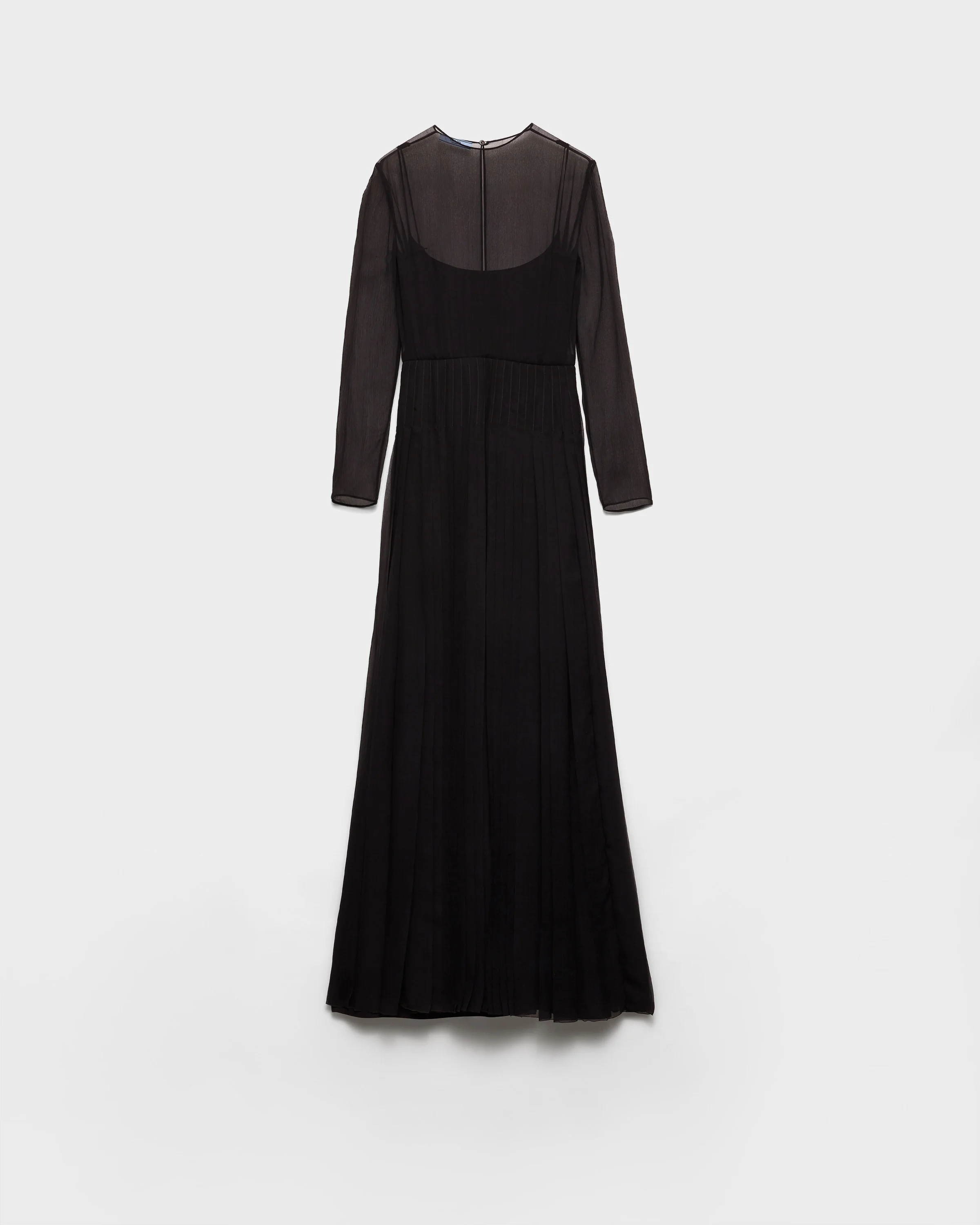The ethereal lightness of silk chiffon shapes the silhouette of this elegant long dress. The fluidity of the pleated skirt adds sophisticated movement to the design. - Product code: P3Q51_125R_F0002_S_OOO - With slip - Round neck - Center-back zipper closure - Long sleeves - Flared hem - Imported - The model is 176 cm tall and wears a size 38 Height: 160cm MATERIALS Main material: 100% silk