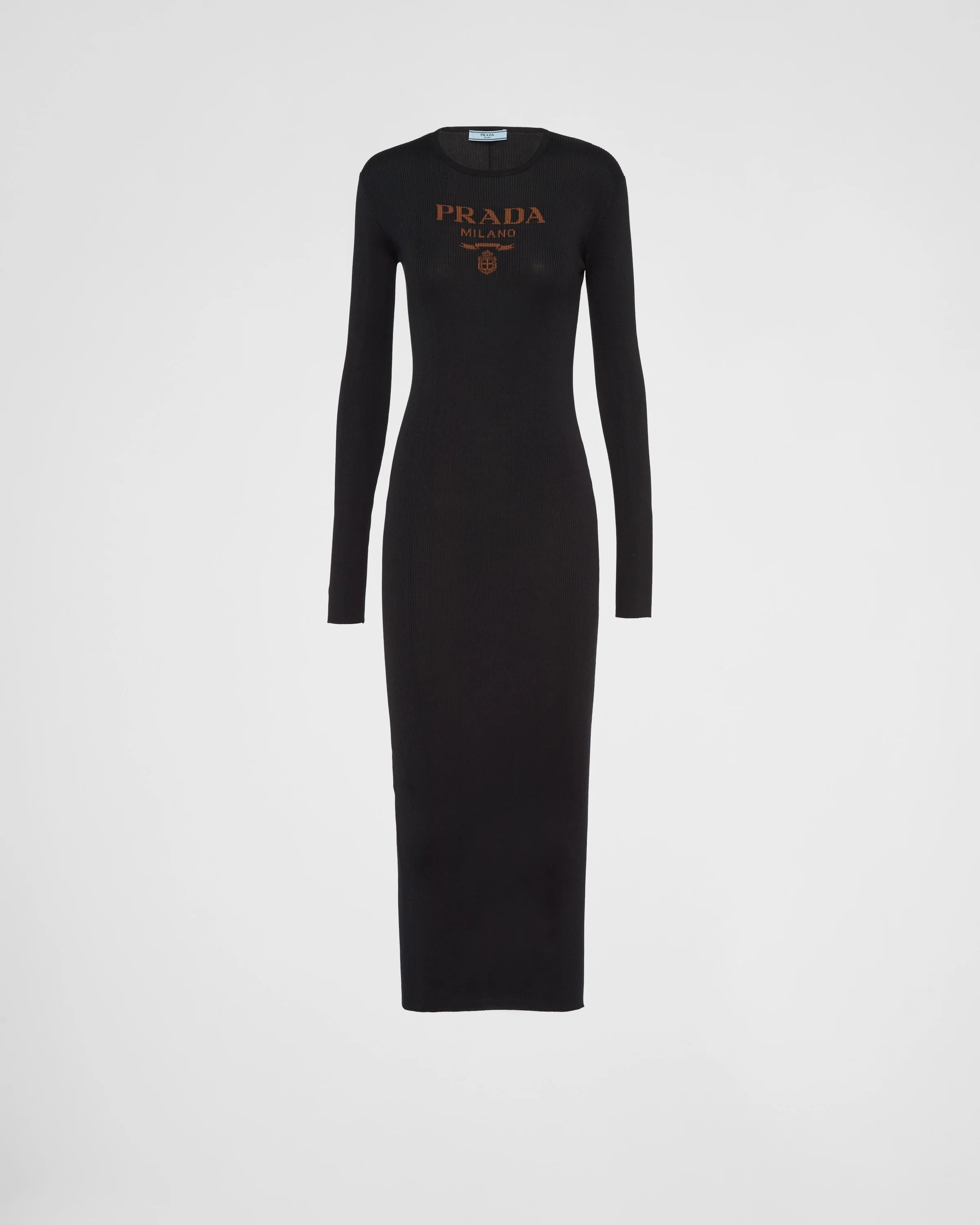 This silk dress with a bold allure and body-hugging lines enhances the feminine silhouette. The garment, completed with ribbed knit trim, is decorated with the fine intarsia logo on the front. - Product code: 23964_11MY_F0002_S_231 - Long sleeves - Ribbed knit - Slim-fit silhouette - Ribbed knit neckline - Regular shoulder - Intarsia logo - Imported - The model is 178 cm tall and wears a size 38 Height: 135cm MATERIALS Main material: 100% recycled silk