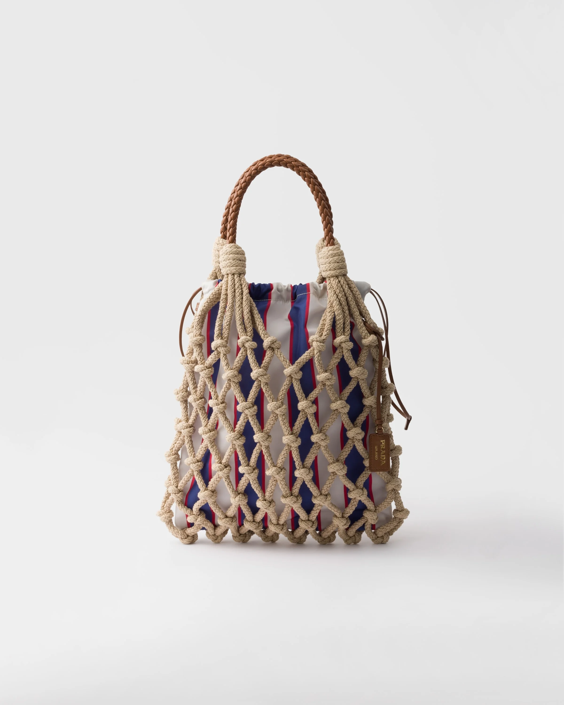 The nautical world inspires the macrame design of this handmade cord bag that embodies fresh elegance and an authentic sense of freedom. This product does not contribute to the SEA BEYOND educational program. - Product code: 1BC111_2DI2_F04HS_V_OOR - Braided leather handles - Removable leather pendant - Metal hardware - Lettering logo stamped on the leather pendant - Removable drawstring pouch, 35cmx29cm - Imported Height: 37cm Width: 30cm MATERIALS Main material: Cotton