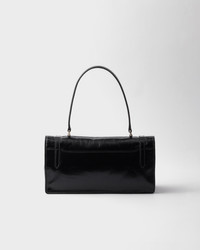 Inspired by rigid and formal work bags, this leather bag with a delicate glossy finish reinterprets classic office silhouettes with a new attitude. The archetypal shape is softened and enriched with sophisticated, feminine details. The vertical clasp, taken from the archives, embellishes the accessory characterized by a long handle that can also be worn over the shoulder. - Product code: 1BN026_2CYR_F0002_V_OOO - Leather handle, drop 20 cm - Metal hardware - Engraved lettering logo on clasp - Flap closure with push-lock clasp - Nappa leather interior with two compartments and two pockets, including one with zipper - Imported Height: 16.5cm Width: 32cm Length: 10cm MATERIALS Main material: Calfskin
