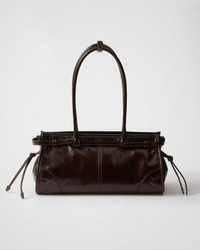 This pragmatic and refined handbag is made of soft leather with a glossy finish that emphasizes its versatile, modern allure. The geometric design blends different influences into one style with a distinctive but sleek aesthetic. Embellished by the sophisticated strap detail, the rectangular silhouette has zipper pockets inside. The enameled metal triangle logo completes the look with its iconic signature. - Product code: 1BA426_2CYR_F01D6_V_MOO - Leather handles, 22 cm drop - Detachable, adjustable shoulder strap Maximum length 125 cm - Minimum length 105 cm - Maximum drop 60 cm- Minimum drop 50 cm - Metal hardware - Enameled metal triangle logo on the front - Zipper closure - Logo-print nylon lining with zipper pocket - Imported Height: 15.5cm Width: 32cm Length: 12cm MATERIALS Main material: Calfskin