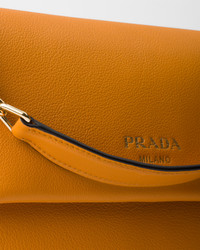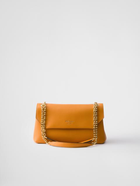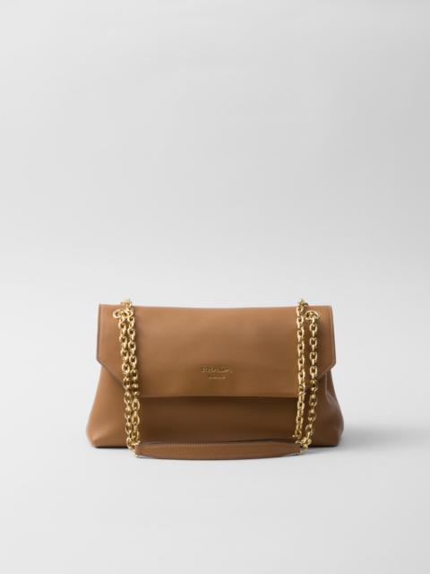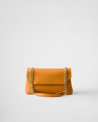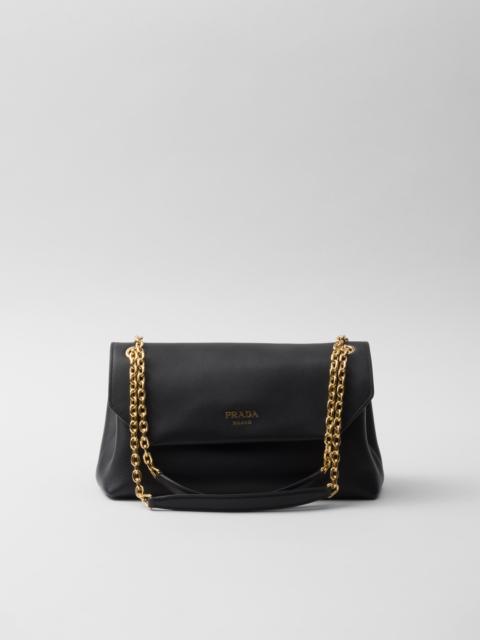 This refined and pragmatic shoulder bag combines details with timeless elegance and a silhouette with contemporary volumes emphasized by the soft touch of leather. The style is characterized by sliding chain handles, nappa leather interior, and back pocket. The accessory illuminated by metal hardware is decorated with the elegant lettering logo embossed on the flap. - Product code: 1BD371_2CYS_F04GT_V_OOO - Sliding chain handles with shoulder pad, drop approximately 30 and 60 cm - Back pocket - Metal hardware - Lettering logo embossed on the flap - Magnetic closure - Nappa leather interior with two pockets, including one with zipper - Imported Height: 16cm Width: 29cm Length: 9.5cm MATERIALS Main material: Calfskin