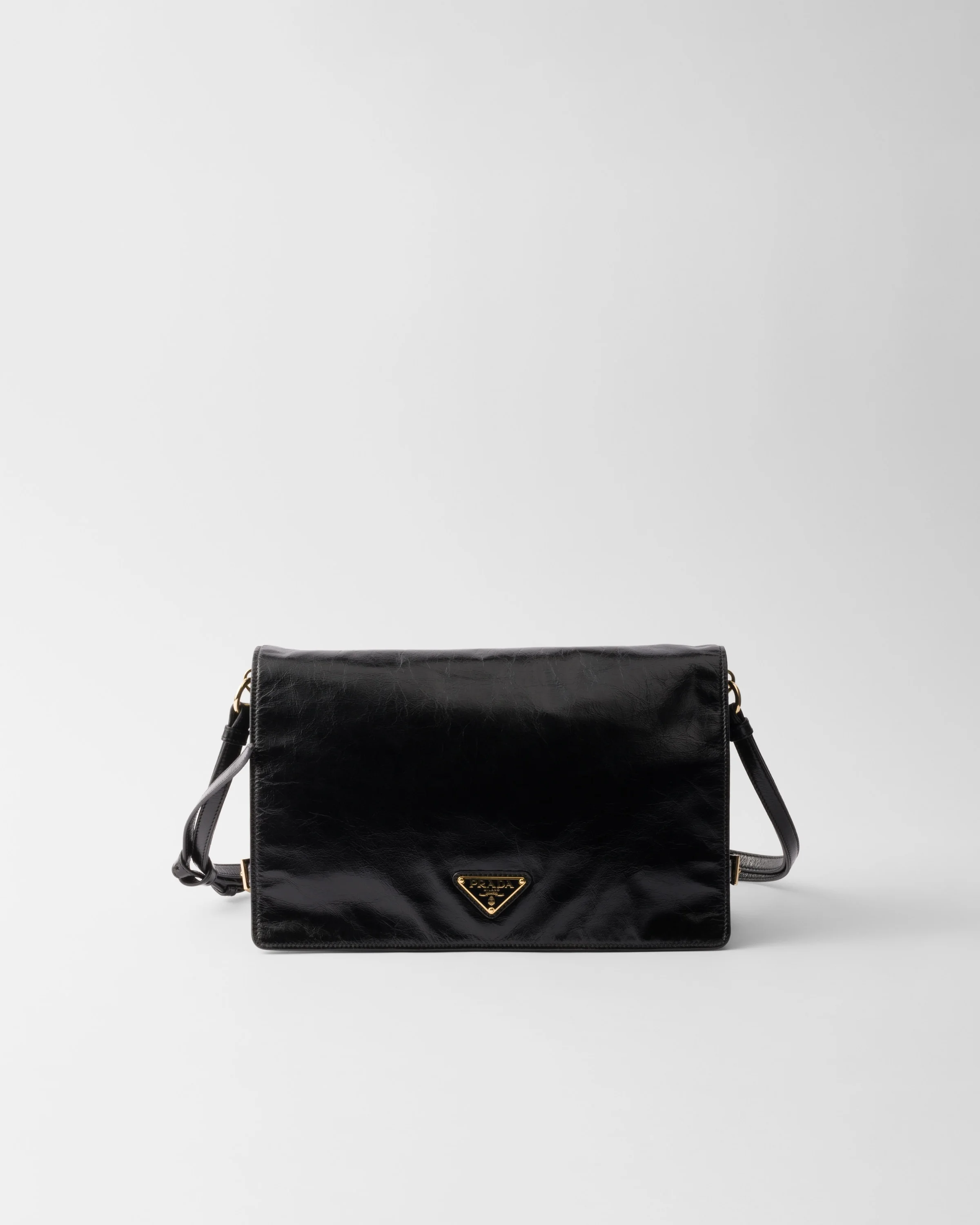 This contemporary, versatile bag is made of leather with a shiny finish that accentuates the sleek silhouette with a casual attitude. The roomy design, completed with metal hardware, is decorated with the emblematic triangle logo. - Product code: 1BD385_2CYR_F0002_V_OVJ - Leather handle, drop 30 cm - Back zipper pocket - Metal hardware - Enameled metal triangle logo on the flap - Flap closure - Logo-print nylon lining with two compartments and center pocket - Imported Height: 18.5cm Width: 30cm Length: 9cm MATERIALS Main material: Calfskin