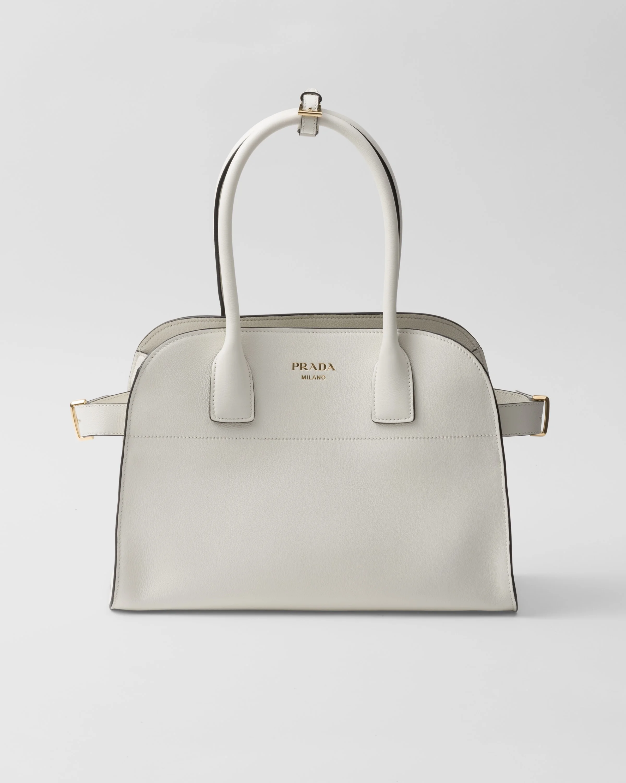 This tote bag with a structure silhouette expresses a modern character and sophisticated allure. The style, characterized by a convenient, large opening, has sleek, minimalist lines emphasized by the soft touch of soft grain leather. The pragmatic accessory is enriched with simple yet refined details that are an expression of the brand's artisanal know-how. The design brightened by the metal hardware is completed by the elegant lettering logo that enhances the refined simplicity of the look. - Product code: 1BG538_2CYS_F0PG7_V_OOO - Leather handles, drop 16 - Metal hardware - Stamped lettering logo on the front - Cotton lining with two pockets, including one with zipper - With purse feet - Imported Height: 23.5cm Width: 32cm Length: 16cm MATERIALS Main material: Calfskin