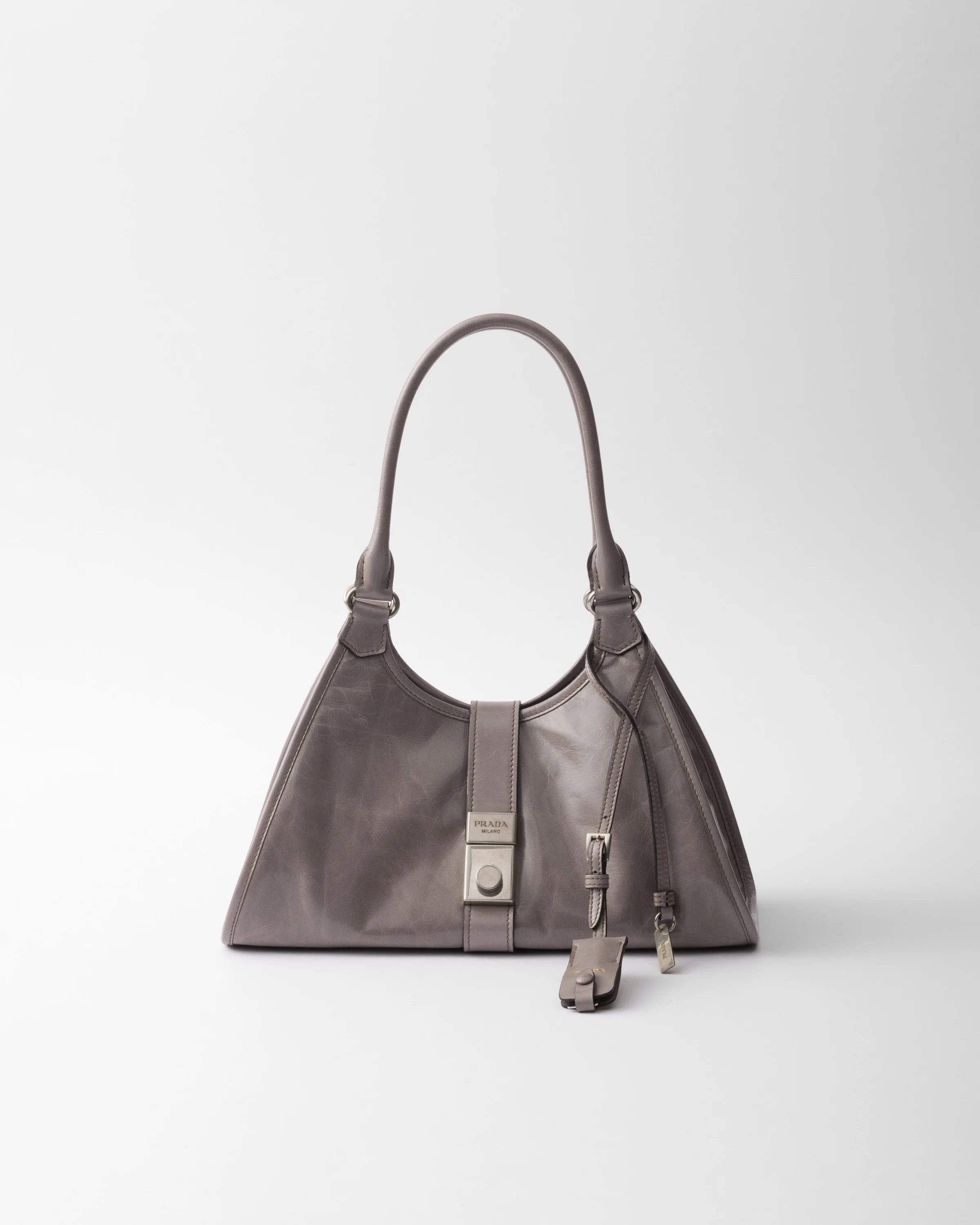 Geometric lines and refined artisan details define this bag with soft volumes. The trapezoidal silhouette features elongated handles to be worn with ease also as a shoulder bag. The vertical clasp inspired by the archives and the leather mirror complete the accessory with a sophisticated note. - Product code: 1BG563_2CYR_F03SF_V_OOO - Leather handles, drop 25 cm - Removable leather mirror - Metal hardware - Engraved lettering logo on clasp - Leather strap closure with push-lock clasp - Logo-print nylon lining with two pockets, including one with zipper - Imported Height: 21cm Width: 32cm Length: 15cm MATERIALS Main material: Calfskin