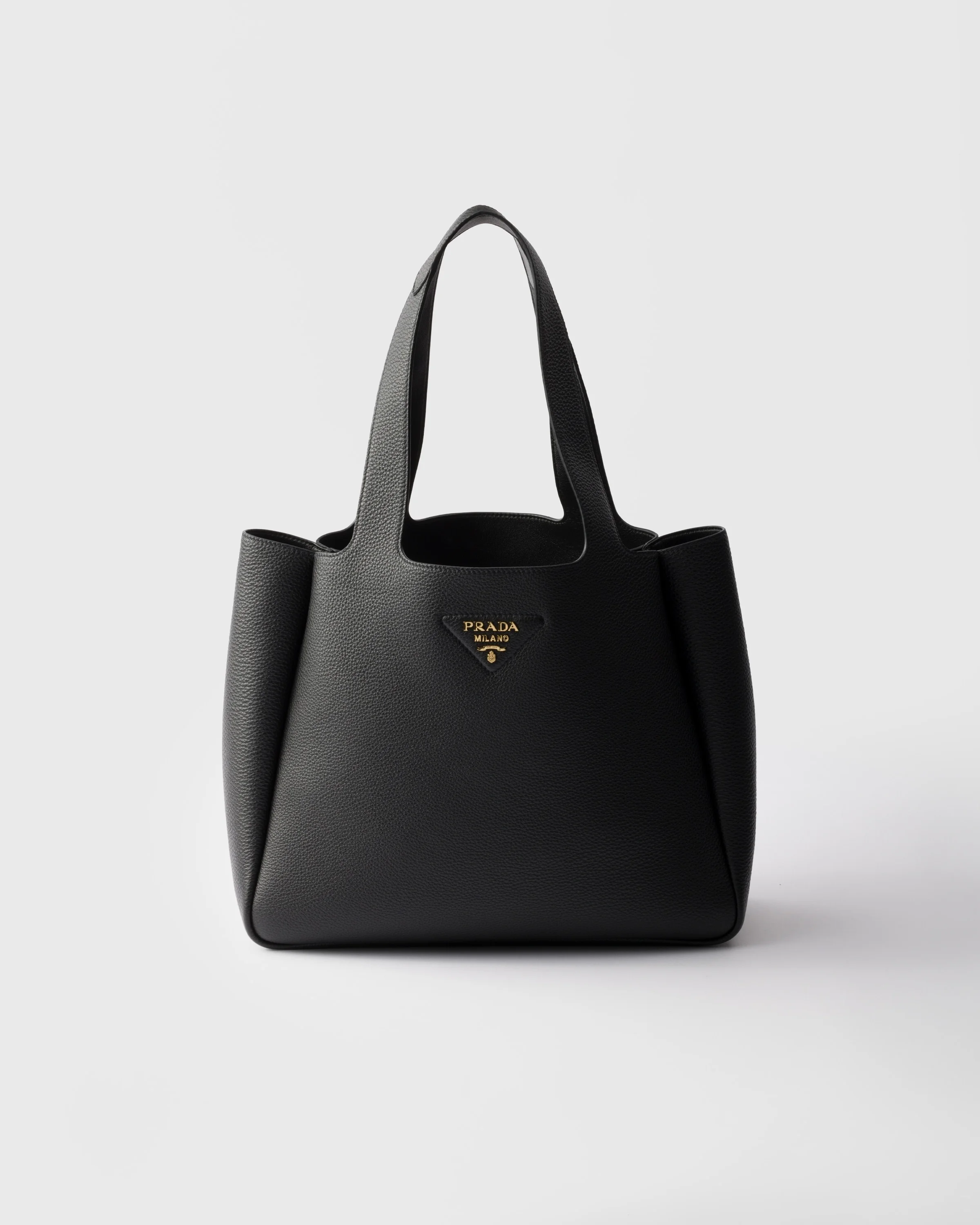 The lightweight silhouette of this leather tote bag is accentuated by the reverse stitching that give a soft, rounded shape to the roomy design. The metal lettering logo on the front elevates the modern and sophisticated accessory. - Product code: 1BG338_2DKV_F0632_V_ONM - Leather handles - Metal hardware - Metal lettering logo on the lower front - Magnetic flap closure - Nappa leather lining with three compartments - Imported Height: 27cm Width: 32cm Length: 14cm MATERIALS Main material: Calfskin