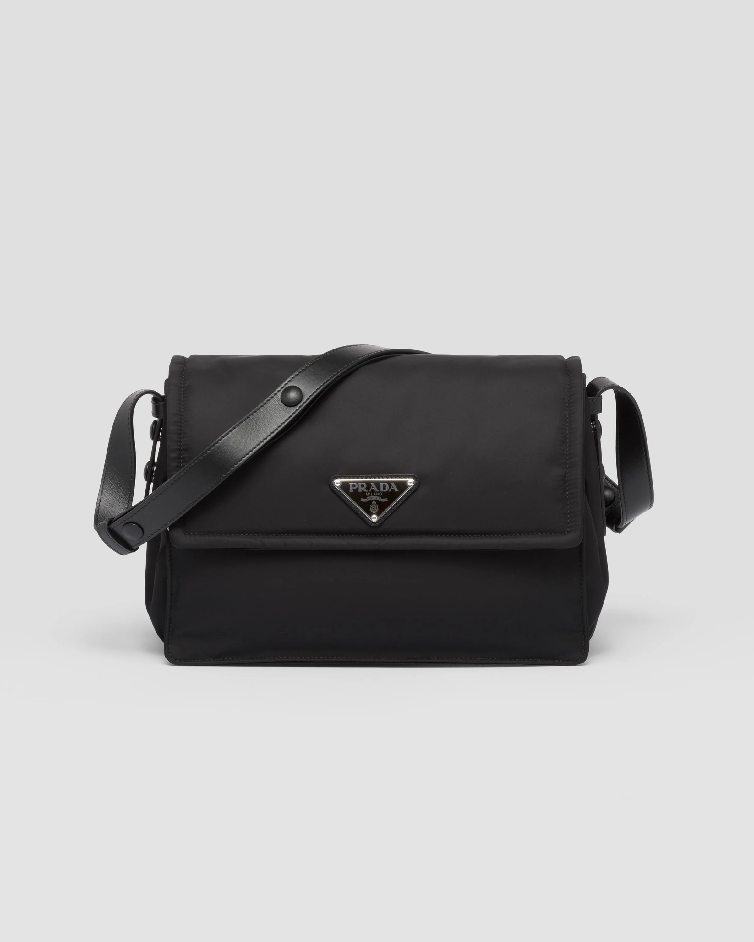 This shoulder bag made of padded Re-Nylon, the distinctive innovative material of the brand, comes with a leather shoulder strap. The accessory completed by a back pocket is illuminated with metal hardware and is decorated with the enameled metal triangle logo that stands out on the flap. For sustainable care to preserve the product's characteristics and reduce microfiber shedding, we recommend not washing the item too often. Let the product air out after every use and have it dry cleaned at a specialized ecological dry cleaners. - Product code: 1BD255_RDLN_F0002_V_OOO - Adjustable leather shoulder strap - Back zipper pocket - Metal hardware - Enameled metal triangle logo on the flap - Flap closure with magnet - Re-Nylon lining with two pockets, including one with zipper - Imported Height: 21.5cm Width: 30cm Length: 12cm MATERIALS Main material: Recycled polyamide