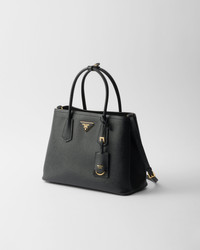 Delicate and refined details instill new life in iconic designs of the brand like the Prada Double handbag. The tonal leather triangle frames the iconic metal lettering logo that gleams on the front, while the detachable shoulder strap makes it possible to wear the accessory also as a cross-body or shoulder bag. - Product code: 1BG887_2A4A_F0002_V_OOG - Leather handles - Detachable, adjustable leather shoulder strap, length 115 cm. Maximum length 120 cm - Minimum length 110 cm - Maximum drop 55 cm - Minimum drop 50 cm - Removable leather key ring - Metal hardware - Metal lettering logo on leather triangle on the front - Snap closure on the sides - Nappa leather interior with flap pocket - With purse feet - Imported Height: 23cm Width: 31cm Length: 14cm MATERIALS Main material: Calfskin