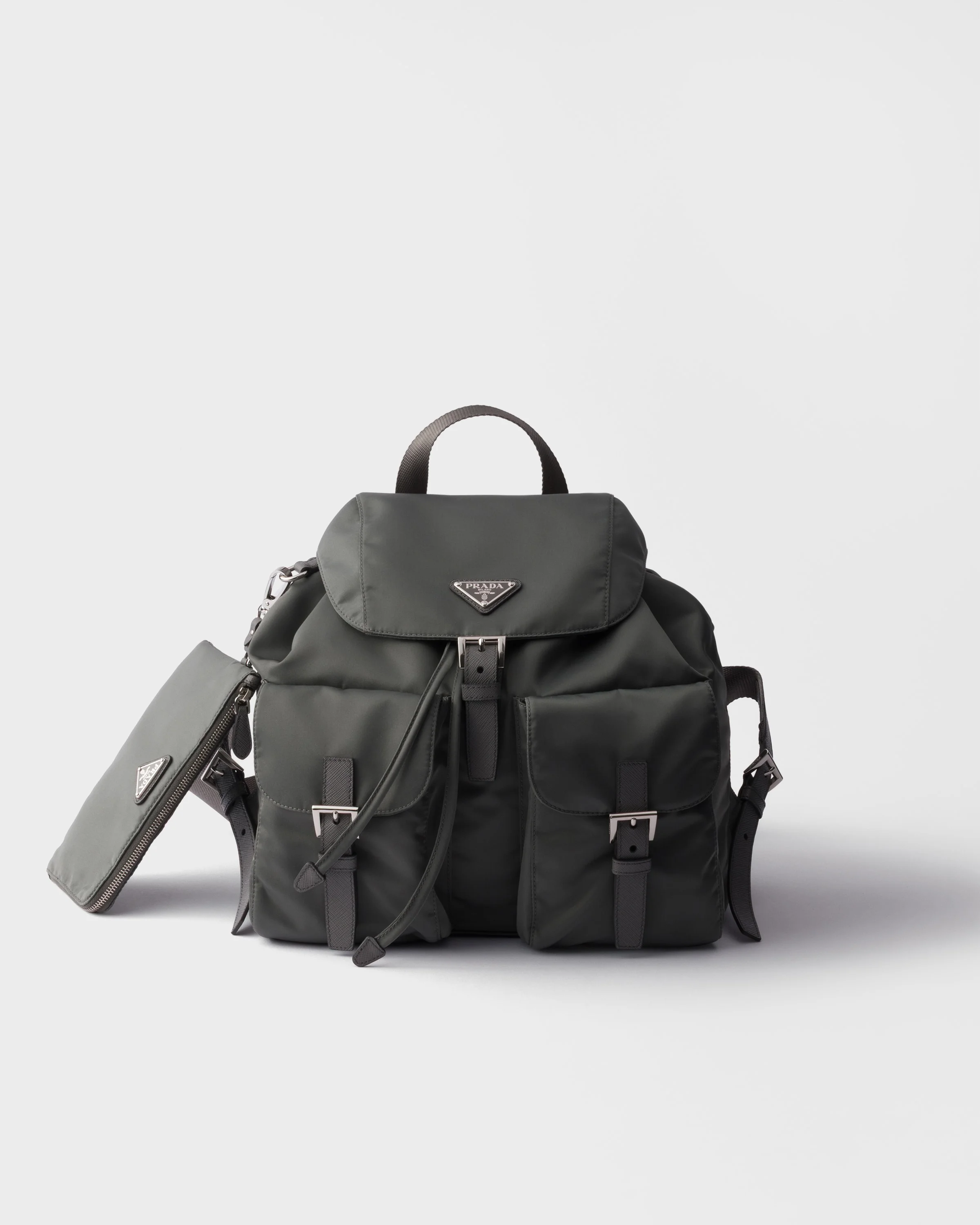 This minimalist, functional, and innovative Re-Nylon backpack sums up the codes of Prada's DNA with its unique and timeless design. The iconic style embodies contemporary, urban style with its sleek design. The light, deconstructed silhouette made of Re-Nylon is embellished with Saffiano leather details. For sustainable care to preserve the product's characteristics and reduce microfiber shedding, we recommend not washing the item too often. Let the product air out after every use and have it dry cleaned at a specialized ecological dry cleaners. - Product code: 1BZ811_RV44_F0048_V_OTM - Saffiano leather details - Adjustable woven tape shoulder straps and handle - Metal hardware - Enameled metal triangle logo on the flap - Drawstring, flap, and strap closure - Logo-print Re-Nylon lining with two pockets, including one with zipper - Imported Height: 32cm Width: 30cm Length: 15cm MATERIALS Main material: Recycled polyamide