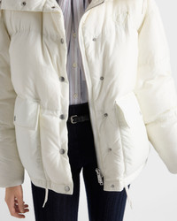 This versatile, contemporary down jacket has an enveloping silhouette with hood. Goose down padding underlines the soft volumes of the garment completed with roomy pockets and decorated with the enameled metal triangle logo. - Product code: 292290_17K9_F0009_S_OOO - Relaxed fit - The garment fits up to one size larger - Goose down padding - With hood - Long sleeves - Zipper and snap closure - Flapped patch pockets - Enameled metal triangle logo - Small internal pocket - Drawstring on the hem and hood - Imported - The model is 180 cm tall and wears a size 38 Height: 68cm MATERIALS Main material: 74% cotton 26% polyamide