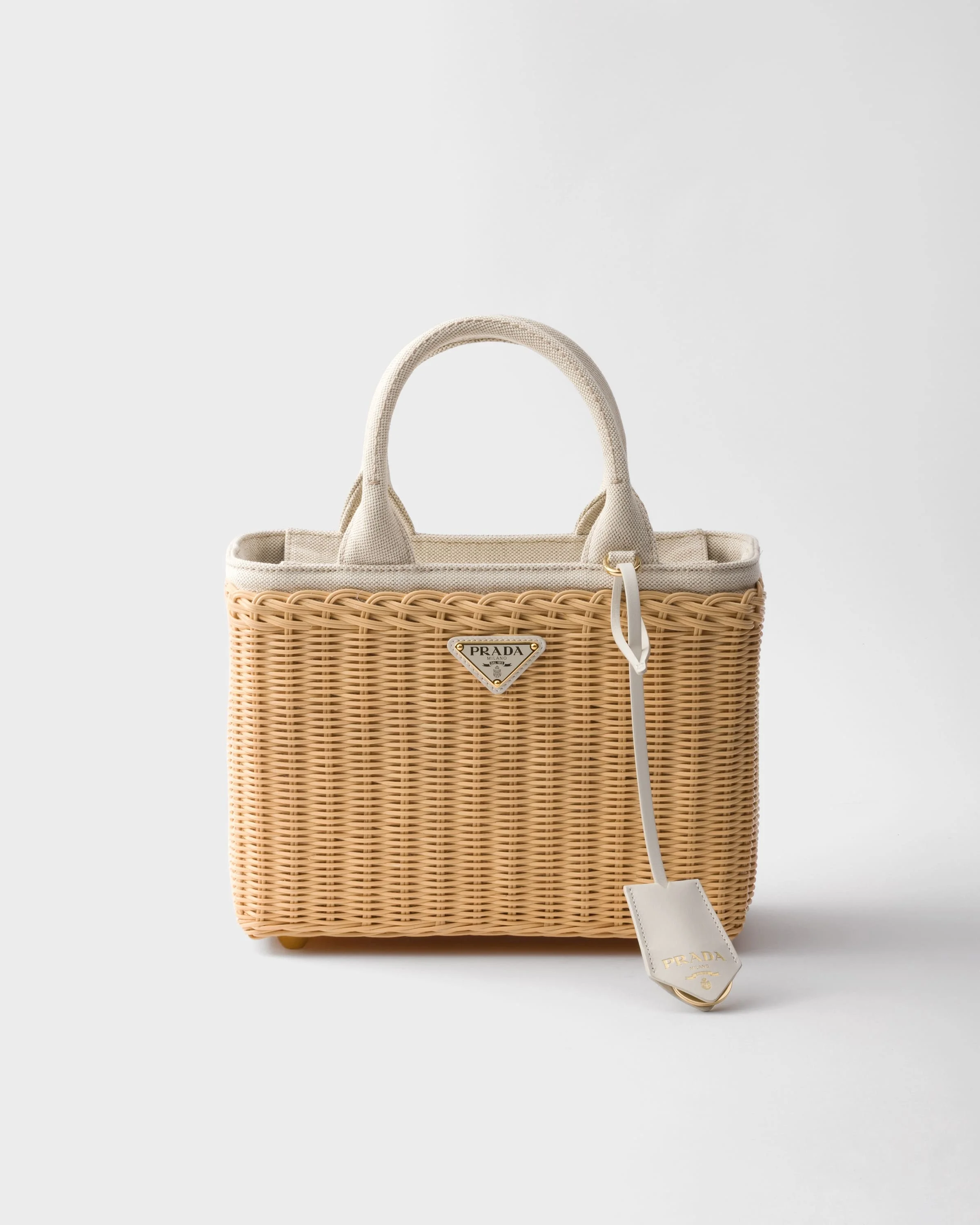 This refined, contemporary tote bag is made of wicker, which gives the sophisticated silhouette uniqueness and structure. The versatile accessory has metal hardware, linen blend handles, and a shoulder strap for versatility. The enameled metal triangle logo completes the style with an iconic note. - Product code: 1BG835_2CYG_F0N86_V_7VM - Linen blend handles - Detachable, adjustable embroidered and logo-print woven tape shoulder strap Maximum length 107 cm - Minimum length 56 cm - Maximum drop 56 cm- Minimal drop 35 cm - Removable leather key ring - Metal hardware - Enameled metal triangle logo on the front - Zipper closure - Linen blend interior with two pockets, one with zipper - With purse feet - Imported Height: 18cm Width: 26cm Length: 11.5cm MATERIALS Main material: Rattan