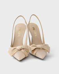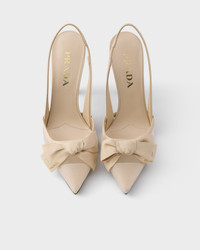 Prada reimagines the design of the classic slingback, a symbol of modern femininity, in new materials and embellishes it with retro-inspired details. - Product code: 1I308O_77T_F0485_F_100 - Upper with brushed leather inserts - Screen-printed leather logo - Leather sole with rubber heel tip and metal lettering logo - Varnished heel, height 100 mm - Imported MATERIALS Main material: Polyamide