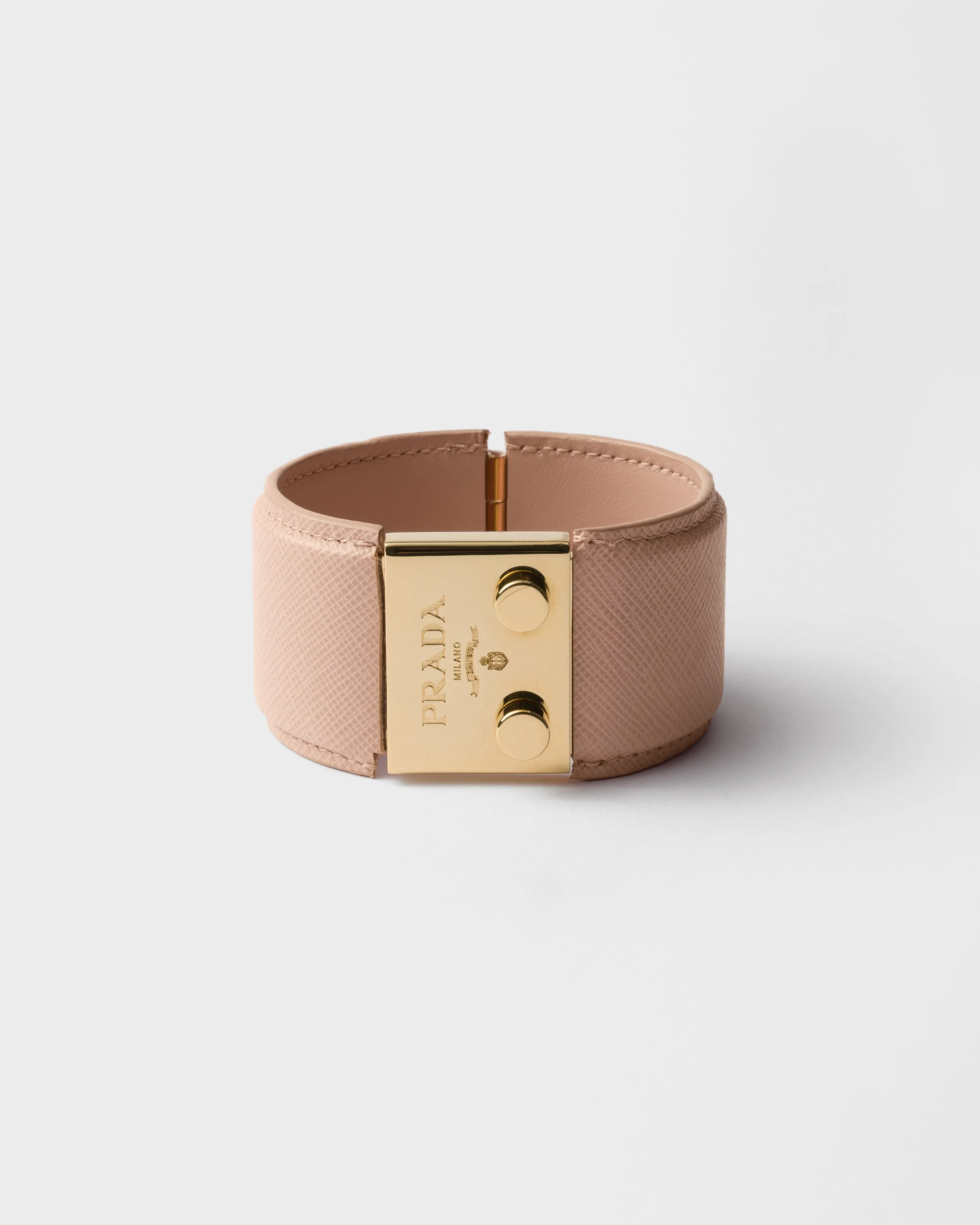 Archival details and emblematic materials borrowed from the leather goods collection define this Saffiano leather bracelet with a distinctive style. - Product code: 1IB728_053_F0236 - Clip closure - Engraved logo - Imported Height: 3.5cm MATERIALS Leather