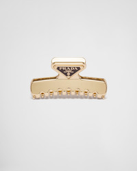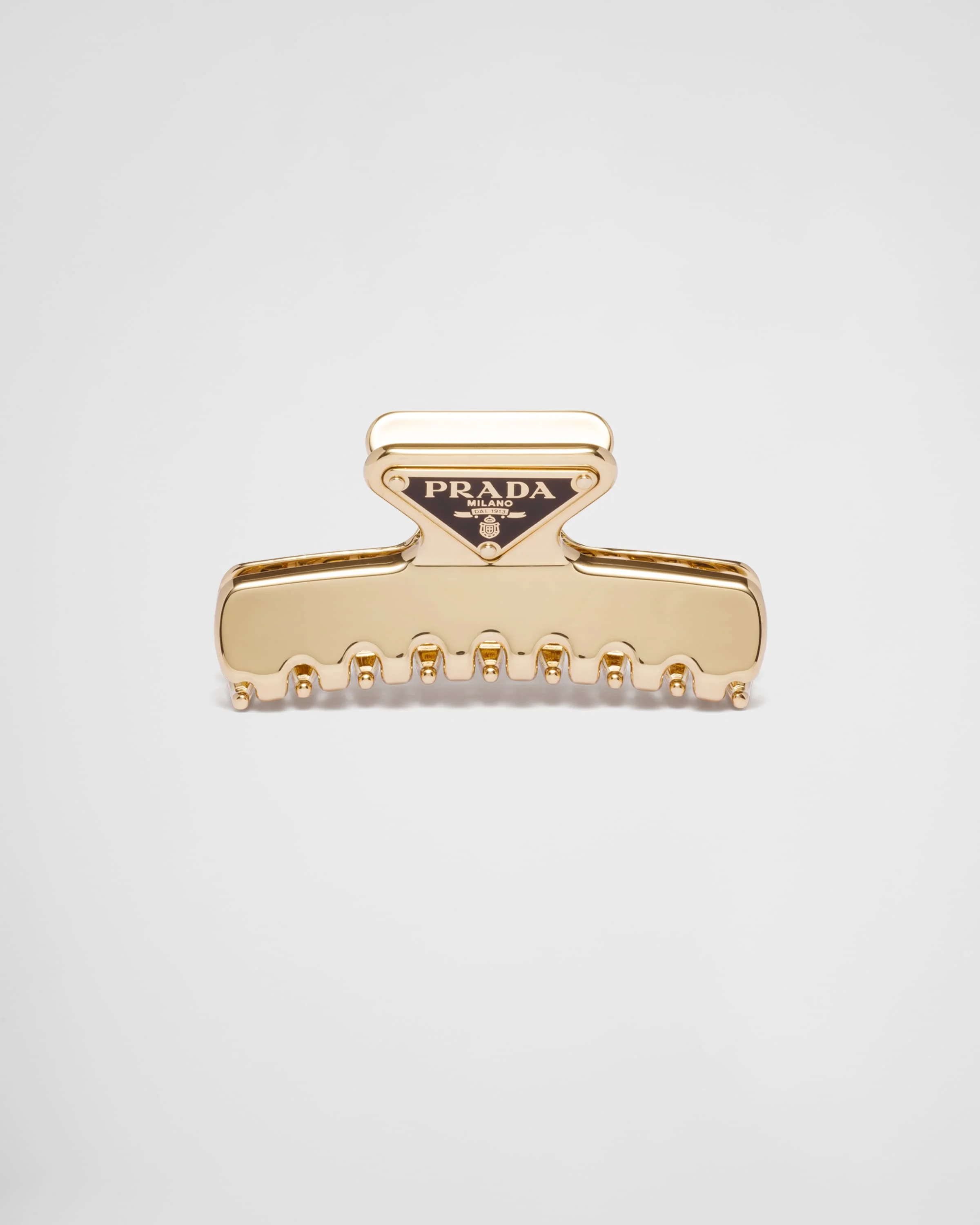 This hair clip with sophisticated and versatile allure is made of enameled metal and decorated with the triangle logo on one end. - Product code: 1IF103_2BA6_F0056 - Enameled metal triangle logo - Imported Height: 4.95cm Width: 10cm MATERIALS Main material: Aluminum brass