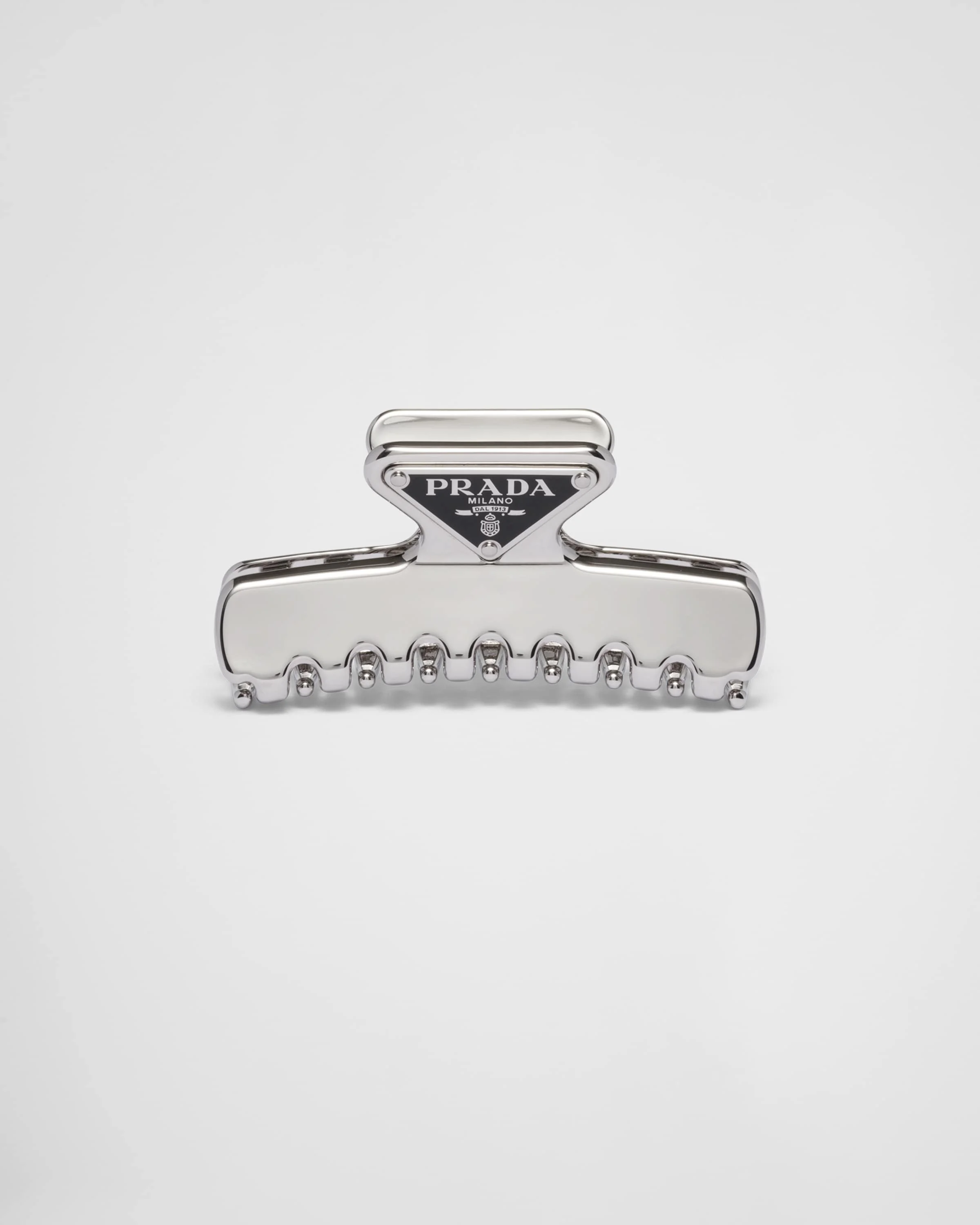 This hair clip with sophisticated and versatile allure is made of enameled metal and decorated with the triangle logo on one end. - Product code: 1IF103_2BA6_F0276 - Enameled metal triangle logo - Imported Height: 4.95cm Width: 10cm MATERIALS Main material: Aluminum brass