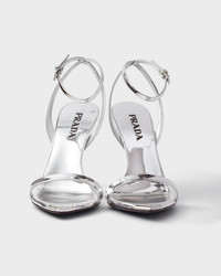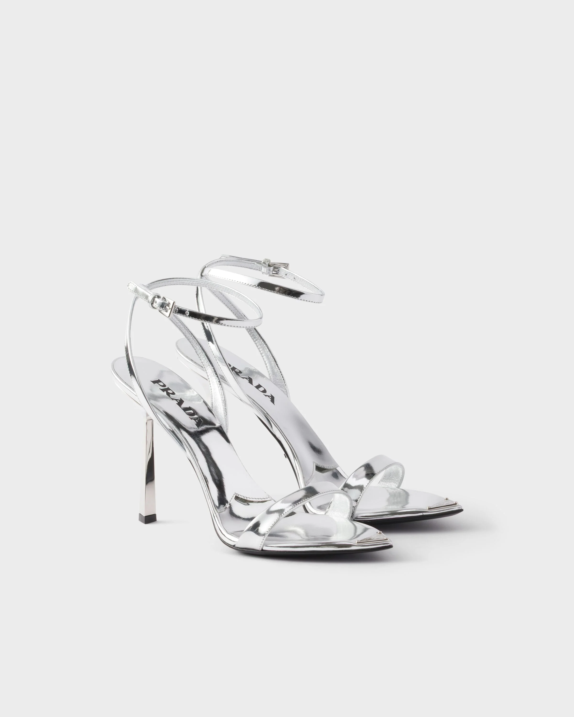 These metallic leather sandals with contemporary style embody sophisticated, feminine elegance. The iconic shape of the logo triangle inspires the geometric lines of the heel, while the ankle strap completes the pointy-toe silhouette. - Product code: 1X923M_3AU1_F0118_F_D100 - Upper with ankle strap and metal buckle - Enameled metal triangle logo - Leather sole with metal lettering logo - Metallic leather heel, height 100 mm - Imported MATERIALS Main material: Calfskin